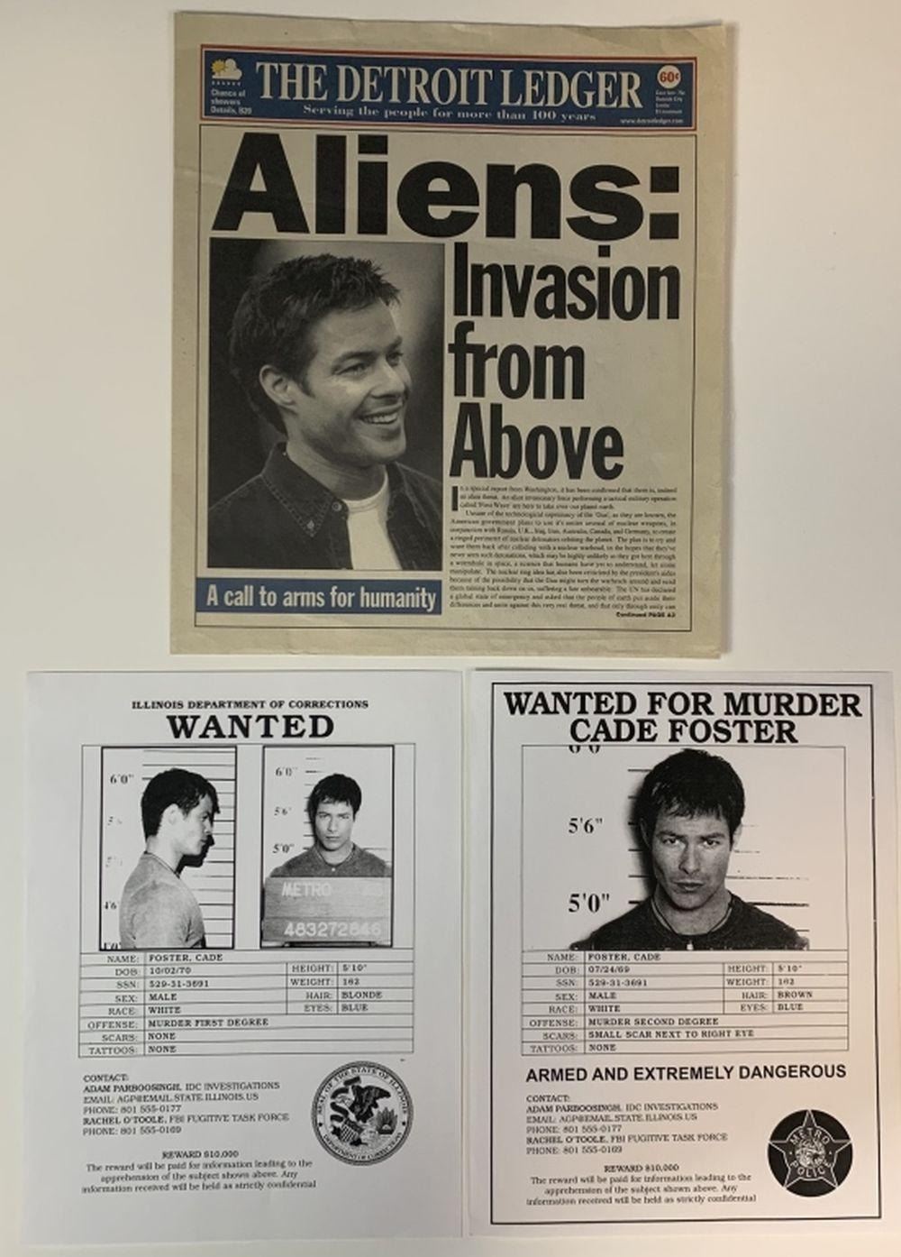 Original prop newspaper and set of 2 wanted flyers used in the science fiction drama television series "First Wave" (1998–2001). where, framed for murder and on the run, a former thief struggles to expose the vanguard of an alien invasion with the help of a conspiracy theorist and newly discovered prophecies of Nostradamus.