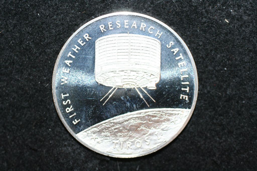 First Weather Research Satellite Sterling Round; Tiros I-The Television Infra-Red Observation Satellite is a meteorological satellite designed to study cloud patterns to permit more accurate forecasting of the weather; Sterling Silver 1 Oz.