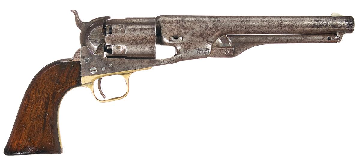 Manufactured in 1860, the first year of production, this revolver is one of only about 4,000 Colt Model 1860 Army Revolvers manufactured with the fluted cylinder. These revolvers appear intermittently in the first 8,000 serial numbers and have a four-screw frame with recoil shields cut for an attachable shoulder stock. Brass trigger guard and iron backstrap. The grips are smooth one piece walnut. The top of the barrel is marked: "-ADDRESS SAML COLT HARTFORD CT.", "COLT'S / PATENT" is stamped on left side of the frame and the 1860 patent date is marked in one of the cylinder flutes. The complete matching serial number is marked on the barrel, frame, trigger guard, cylinder, wedge, arbor pin and backstrap. Blade front and hammer notch rear sights, and fitted with one piece smooth walnut grip. Some of these will factory letter, many of which to Confederate retailers. Quite possibly the successful bidder will luck out!