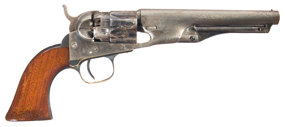 Manufactured early in the first year of production, 1861, with the top of the barrel marked "ADDRESS SAML COLT HARTFORD CT", the left side of the frame is marked "COLTS / PATENT" and one cylinder flute is marked with the patent date marking. The barrel and cylinder were blue, the frame, loading lever and hammer casehardened and the trigger guard and backstrap silver plated brass. Matching serial number on the barrel, frame, trigger guard, arbor pin and backstrap, and partial number "429" on the wedge. Fitted with smooth one piece varnished walnut grip.