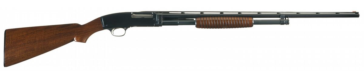 Manufactured in 1933, the first year of production. It has an orange fiber optic front sight, a white mid bead sight, is choked modified and has a 3 inch chamber. The barrel has the first style Pre-War marking and does not have a visible proofmark. Mounted on an 18 groove round walnut forearm and pistol grip stock with checkered plastic buttplate. Length of pull is 13 7/8 inches.