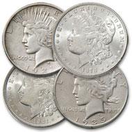 A lot of 4 coins- 1921 and 1935 Peace- 1878-1921 Morgan- Good to vg grades-