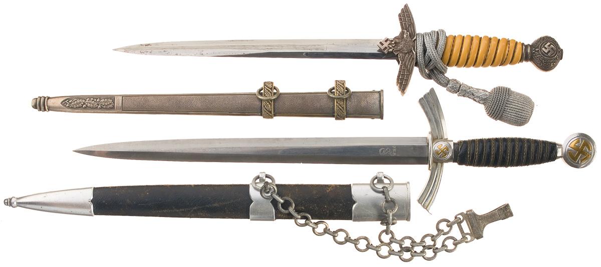 1) 2nd Model Luftwaffe dagger, no makers marks, 10 inch blade, eagle cross guard, swastika and oak leaf pommel, wire wrapped yellow celluloid grip, silver portapee and solid acorn, and sheath with oak leaf and pebbled designs. 2) 1st Model Luftwaffe dagger, Weyersburg production, 12 inch blade, alloy guard and pommel with sun wheel swastikas, blue leather grip with wire wrap and blue leather sheath with alloy fittings and chain hanger.