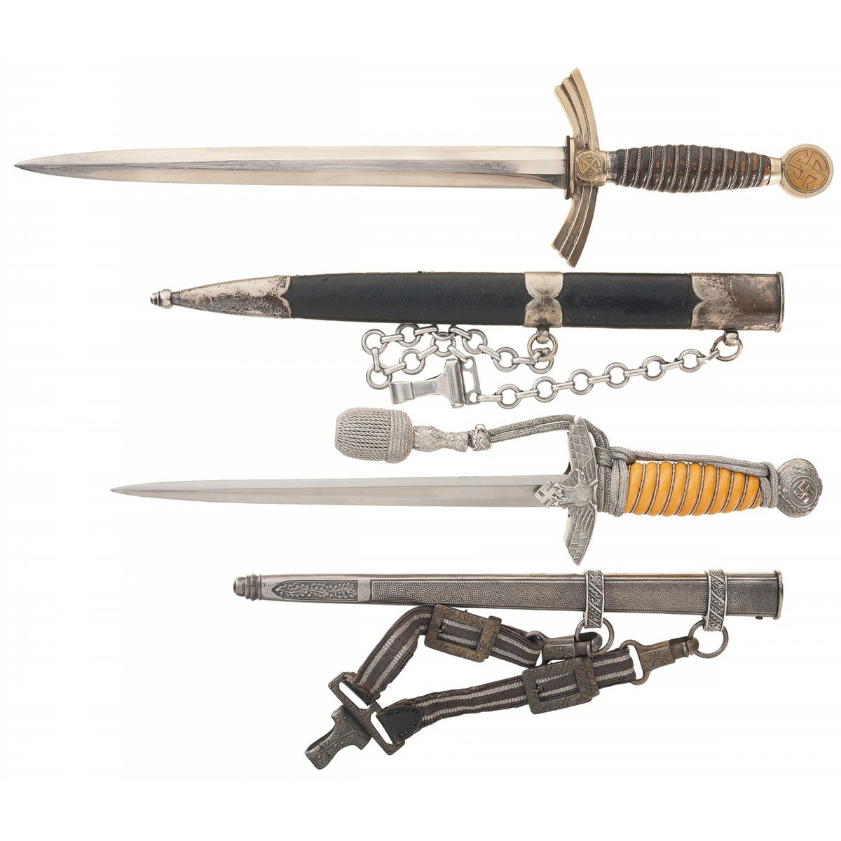 1) F.W. Holler 1st Model Luftwaffe Dagger, 17 5/8" long, 11 7/8" blade, silver finished hilt, blue leather sheath and grip, and alloy chain hanger. 2) WKC 2nd Model Luftwaffe Dagger, 15 1/4" long, 10" blade, yellow celluloid grip, silver portapee and gray hanger. Very good overall.