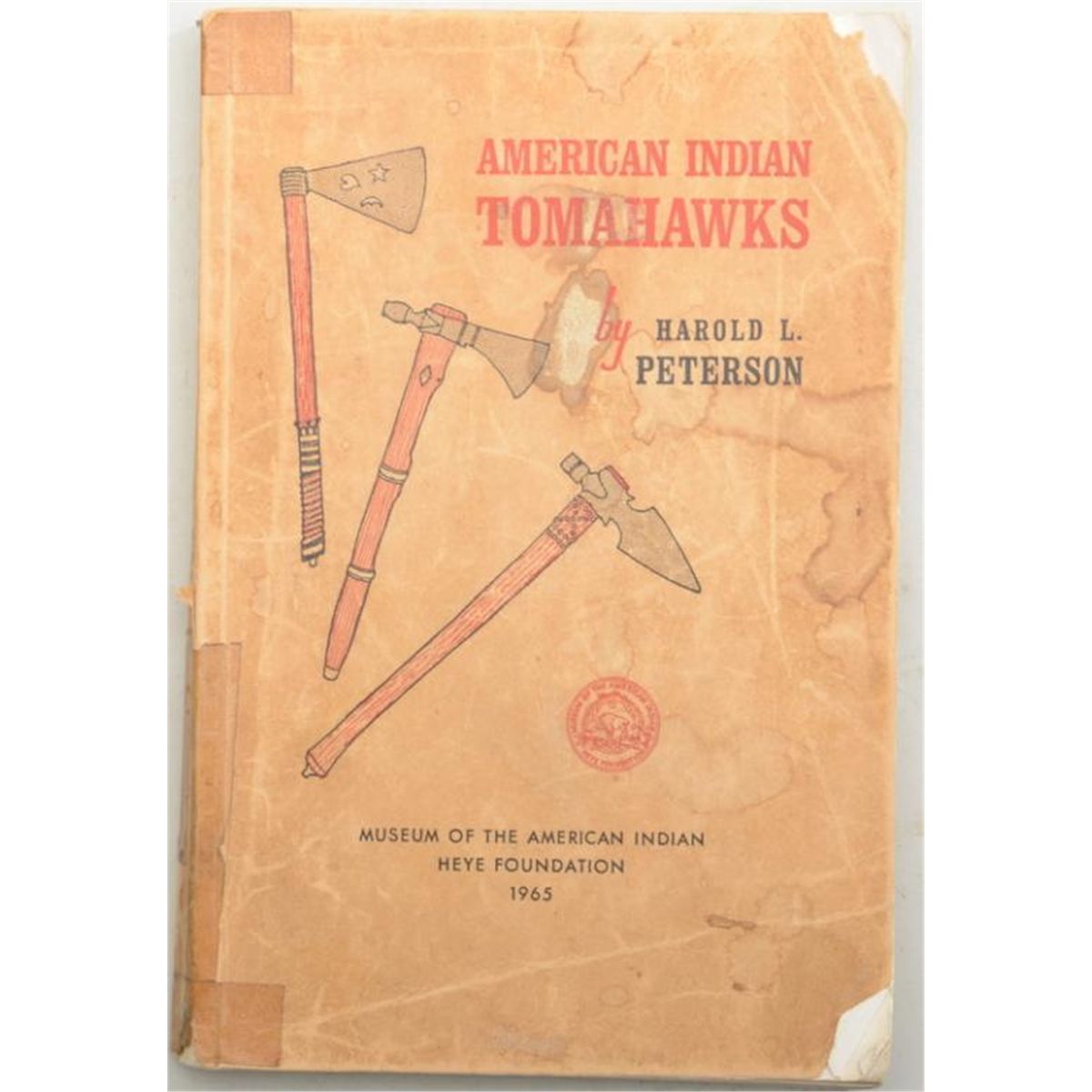 First edition soft cover book “American Indian Tomahawks” by Harold L. Peterson, Chief Curator of the National Park Service in the 1960’s and an expert on this subject. The book is in overall good condition withsome staining and repair to the cover and edges but fine descriptions and photos documenting different styles and types of Tomahawks. An important reference source. Est.: $75-$125.
