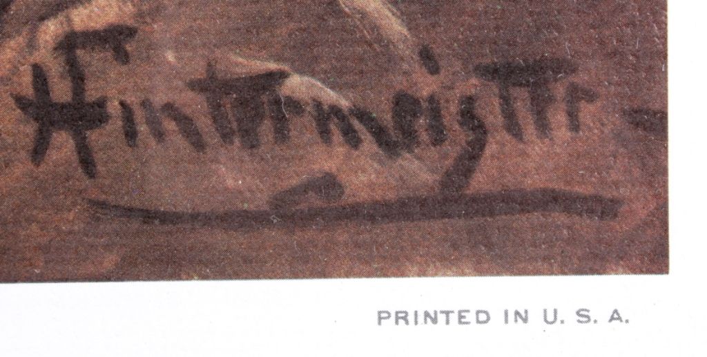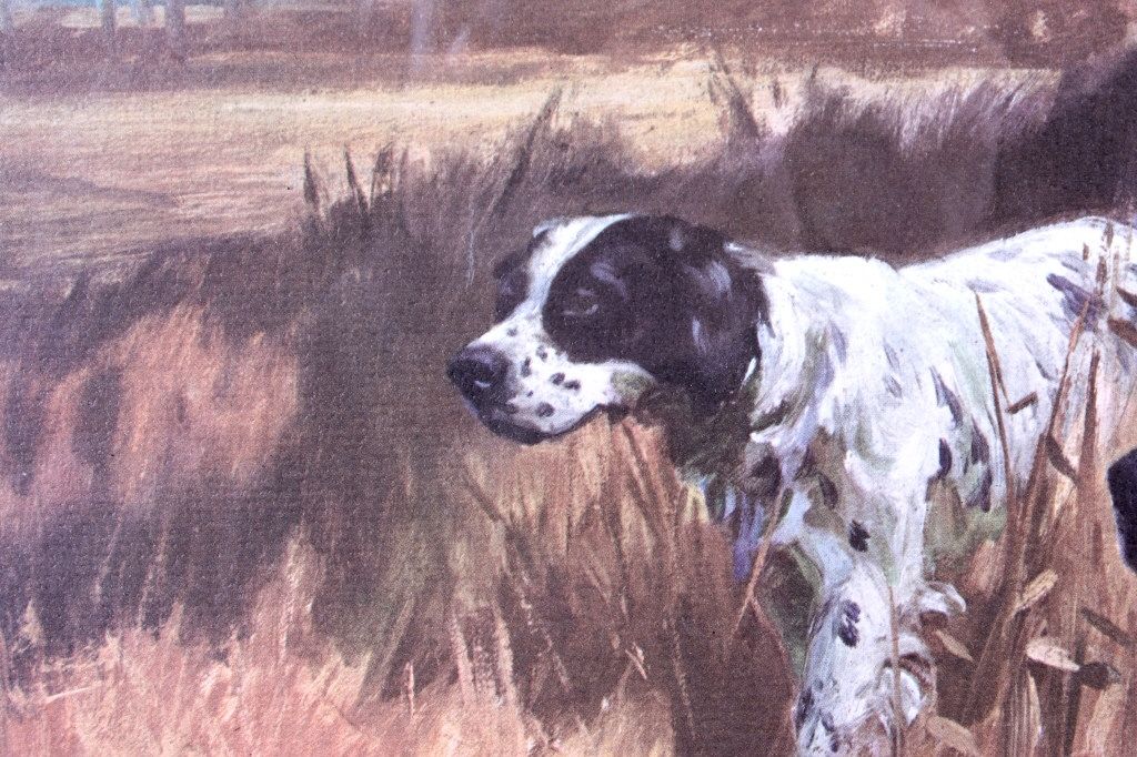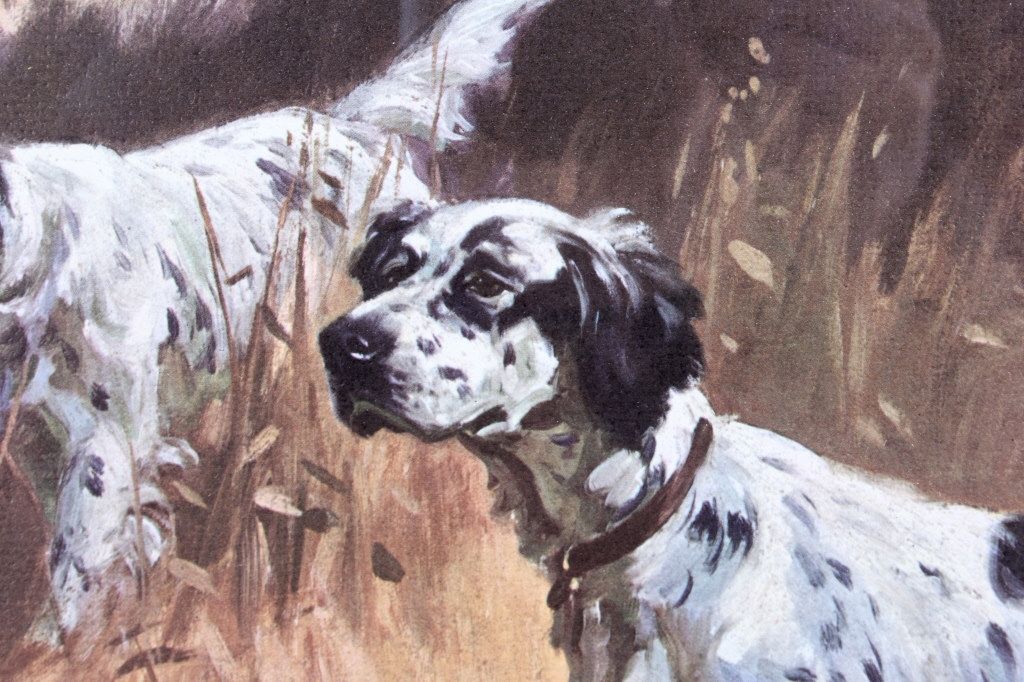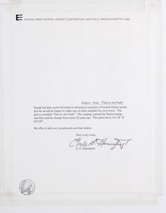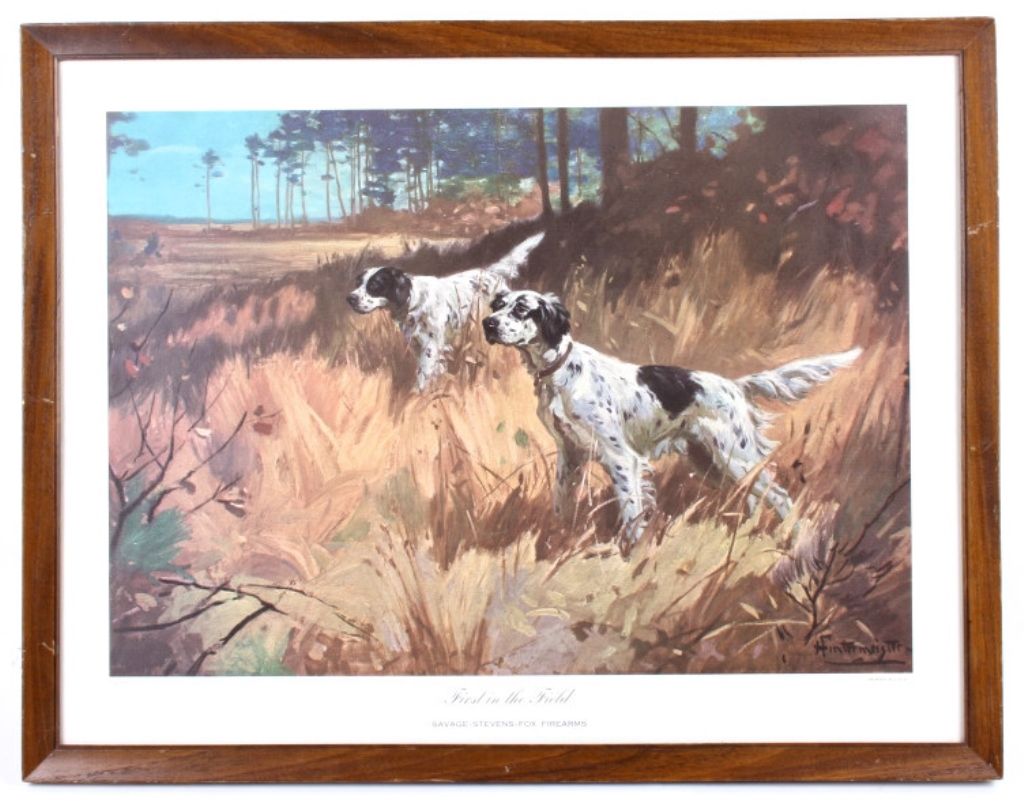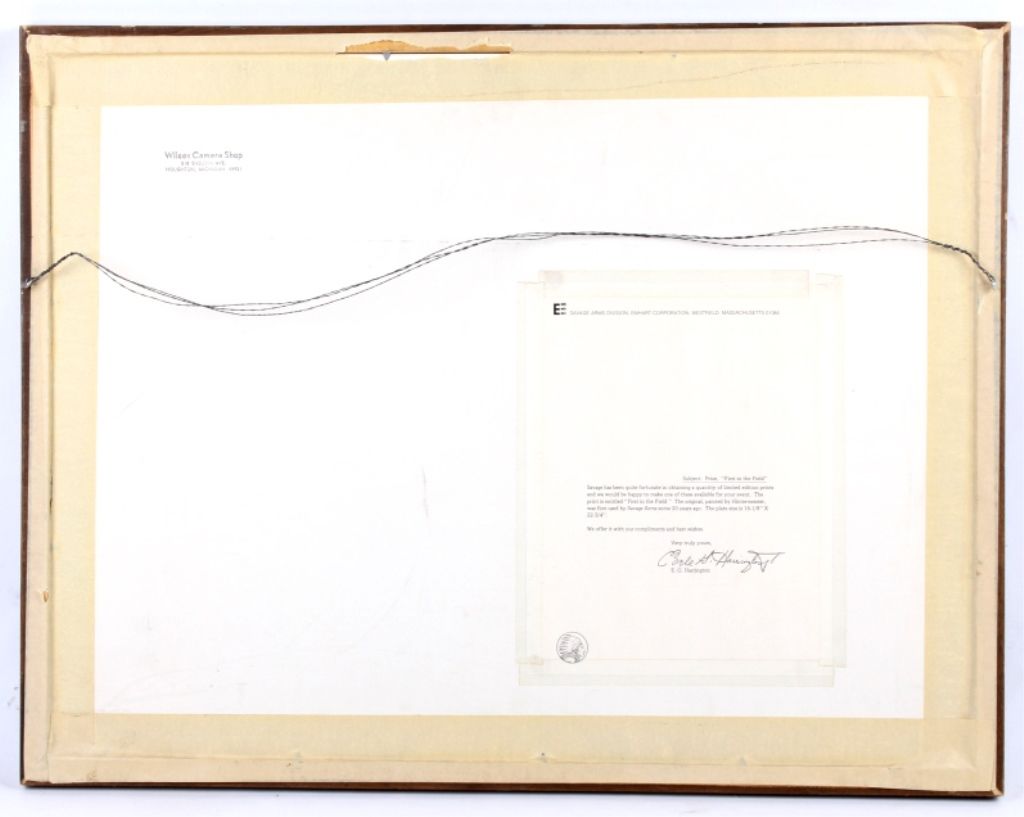 This is a HY Hintermeister and sold by the Savage Arms company. This piece depicts to hunting dogs in the field for a hunt. This print is well framed and has a certification letter on the back. The Print measures16"x22" the frame measures 21.5"x27.5".
