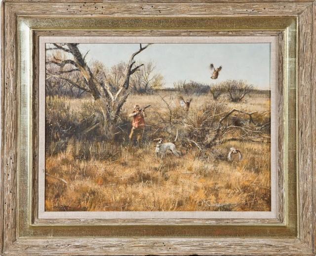“First of the Day” oil painting by Robert K. Abbett (born 1926) dated 1987. Measuring 18” by 24”. Depicts hunter and his dog hunting birds. From the Robert Petersen Collection. Est: $1,500 - $3,000