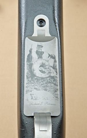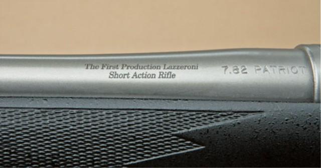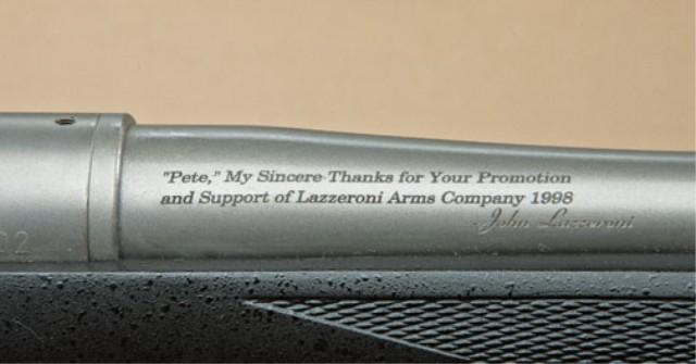 First production Lazzeroni short-action high grade sporting rifle in 7.82 Patriot caliber, serial #L9876002. The right side of the barrel is lazer etched “Pete, My sincere thanks for your promotion and support of Lazzeroni arms company, 1998. Signed John Lazzeroni”. The floorplate shows a portrait of Mr. Robert Petersen with downed trophy ram, which is photo etched. The rifle is 42-3/4” overall with 22-1/2” barrel. Shows satin finish, composite stock, and mounts for QD sling swivels. This Arizona maker is highly regarded for his premium target-grade rifles which cost approx. $4,000. A rare opportunity to own the first production model short rifle presented by Lazzeroni. The rifle shows slight use only, 98-99% plus. From the Robert Petersen Collection. Est: $1,250 - $2,500