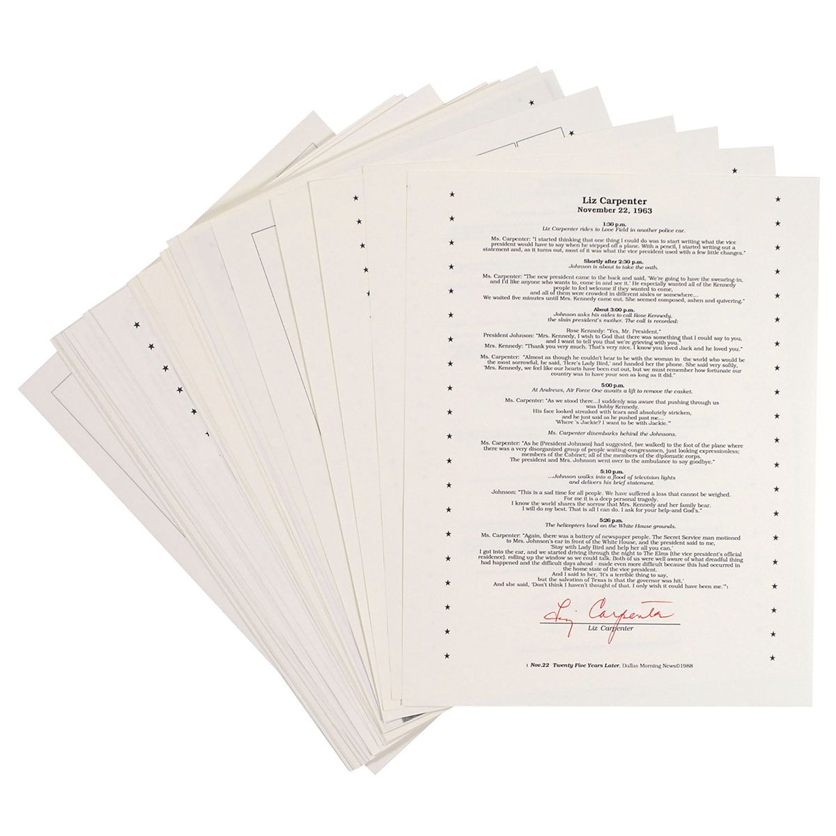 Collection of 41 souvenir typescripts of firsthand accounts of the assassination and its aftermath by various police officers, witnesses, reporters, and political figures, 8.5 x 11, each signed in ink by the given witness. Signers are: Pierce Allman (2), Ann Atterberry (2), Kent Biffle (3), Charles L. Bronson (2), Liz Carpenter (2), Waggoner Carr (2), Col. Lewis Hanson (2), Bobby Hargis (3), Gerald L. Hill (2), Virgil E. Hoffman (3), William A. Holmes (2), Jimmie L. Popplewell (3), Earl Ruby, Bert N. Shipp (2), Theodore C. Sorenson (4), Henry Wade, Wes Wise (4), and William H. Zedlitz. In overall fine condition.