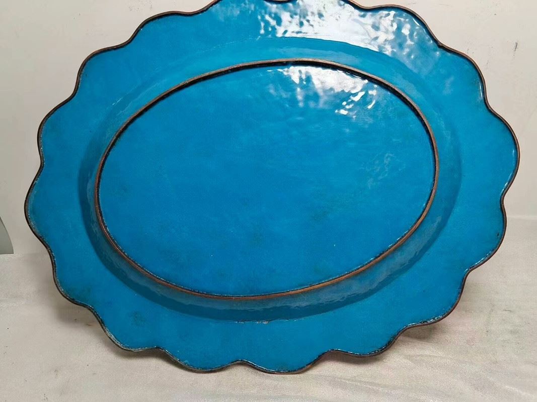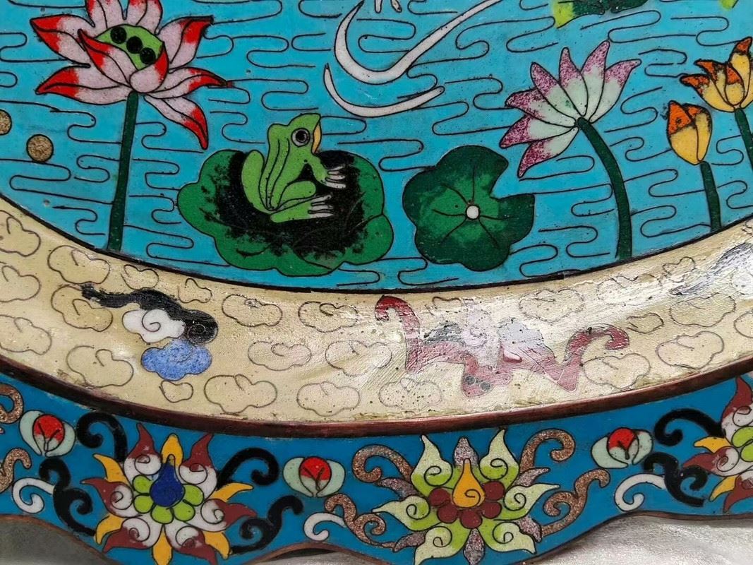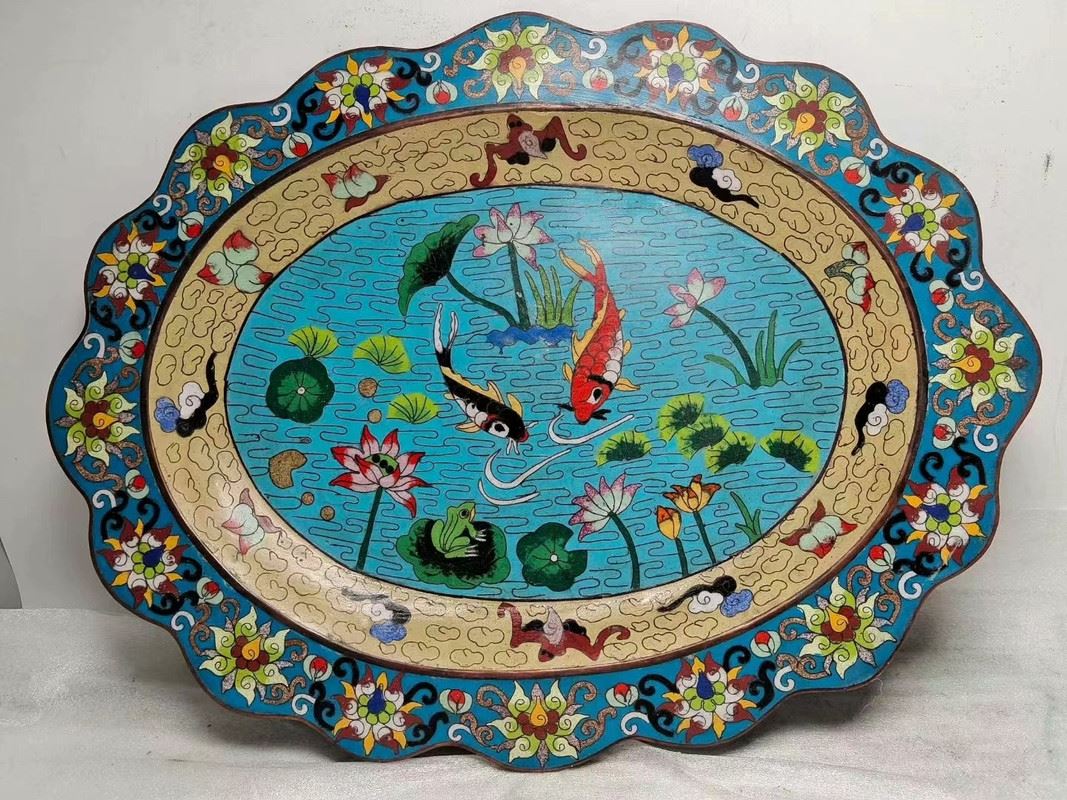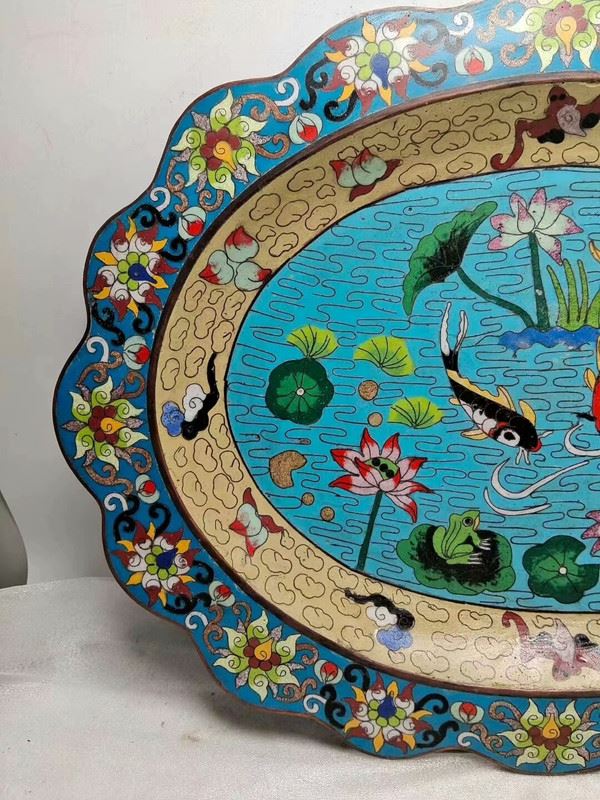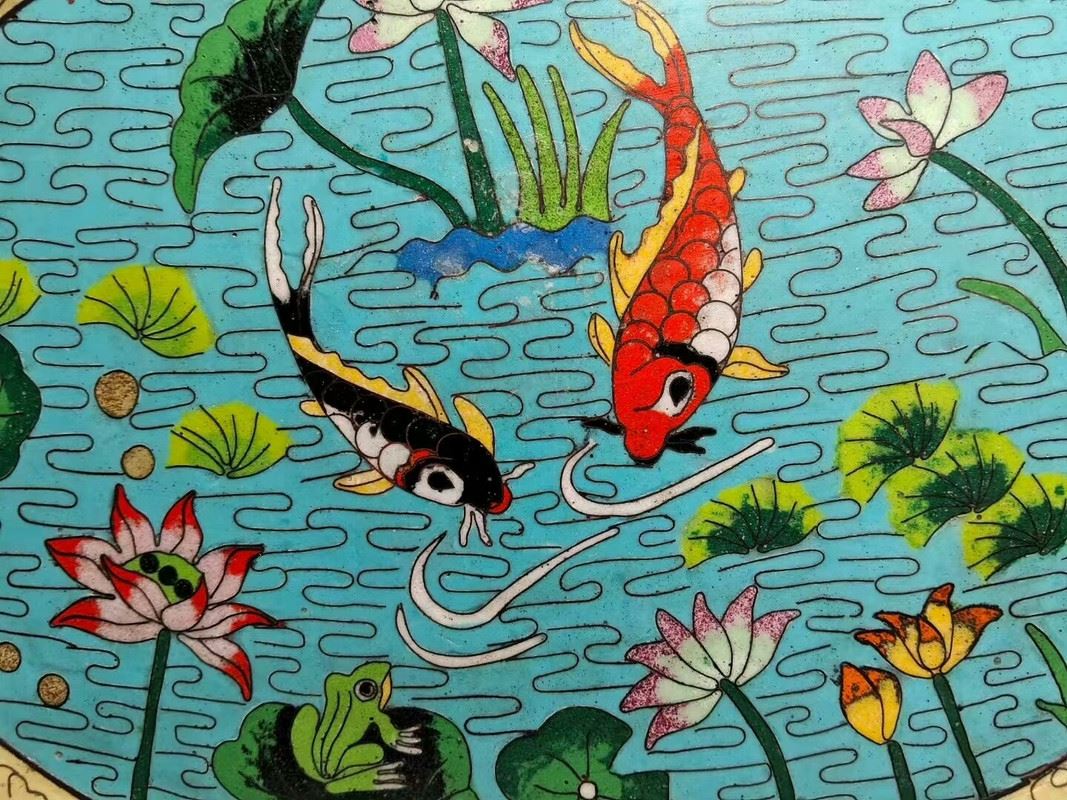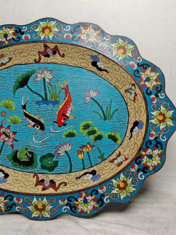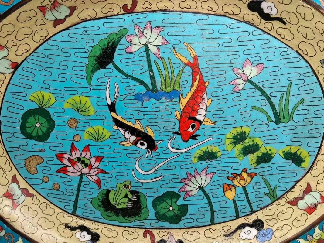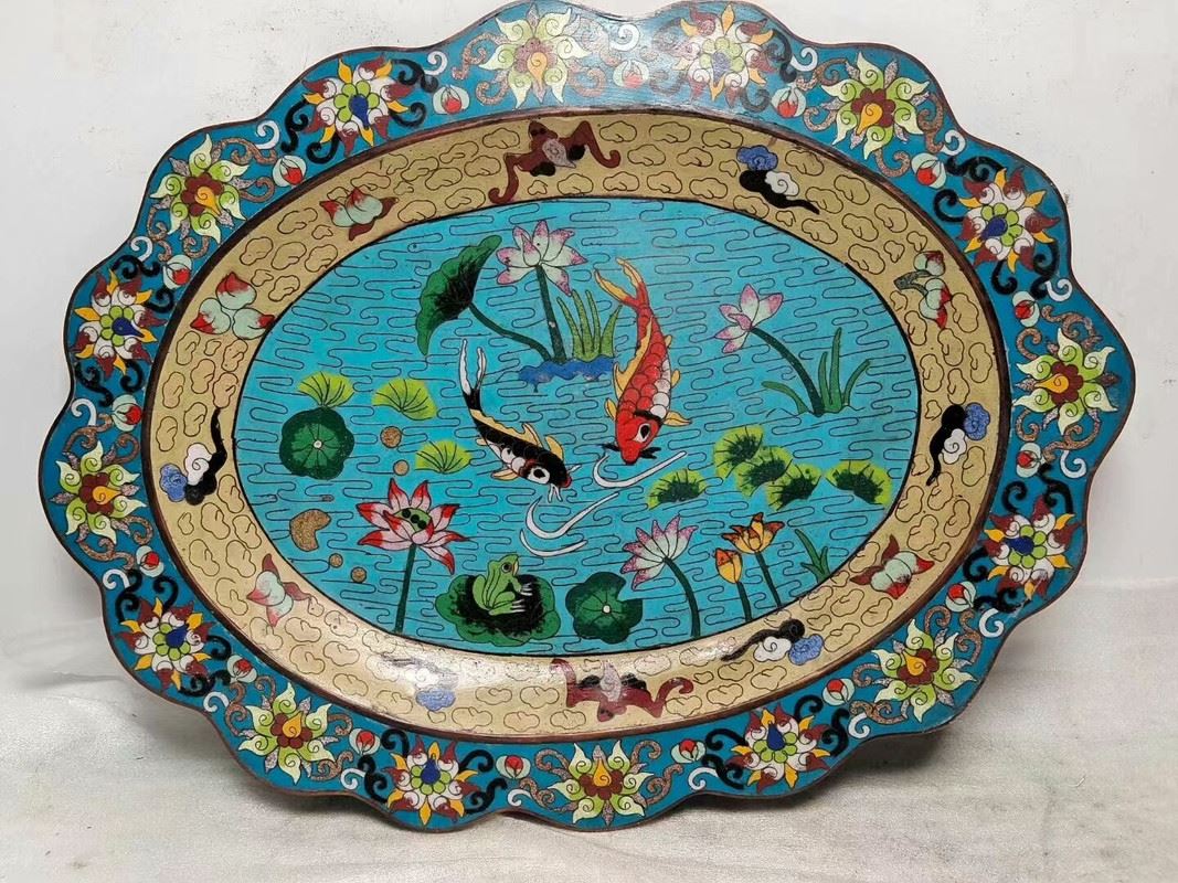 This is a Cloisonné plate featuring koi fish swimming in a pond, surrounded by lotus flowers and lush greenery. The vibrant colors and natural scene are beautifully portrayed, with the blue base and golden border highlighting the exquisite craftsmanship typical of traditional Cloisonné.