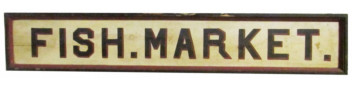 Fish Market Outdoor Wood Sign. Circa 1910. Excellent original condition. 77 X 13 1/2 inches.