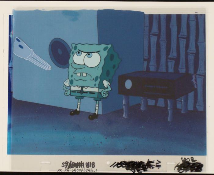 To create production cels, the original animator's drawing is transferred onto an acetate cel (by hand-inking and/or photo copying). The cel is then hand-painted on the reverse side. The printed background is ready to be matted and framed. It is a colored background with a cel and has the animator's notations at the bottom of the background and the cel. The background is a printed reproduction background. The cel has multiple layers; first is a jellyfish, the second cel is SpongeBob's eyes, then the third cel is SpongeBob's arm and the last cel is SpongeBob's body. There is slight paint fade to SpongeBob's outline.