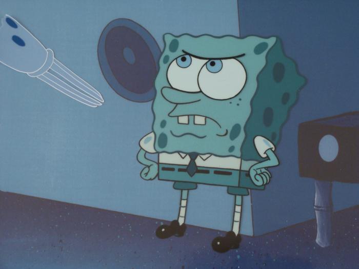 This animation cel and reproduction background are from the Nickelodeon TV show SpongeBob Squarepants. The story takes place under the deep blue sea in Bikini Bottom, where SpongeBob resides. SpongeBob, who is a yellow, porous sponge, is your typical happy-go-lucky character, as he is always cheerful and enjoys making people laugh. Patrick Star, SpongeBob's neighbor who is a starfish, is your average children's show idiot, as he boasts knowing nothing and is often getting himself into ridiculous situations. Between the homes of these two lies the home of the miserable Squidward, a squid, who is known for being grouchy and playing tricks on SpongeBob and Patrick. Both SpongeBob and Squidward work at the Krusty Krab, a fast food business run by the greedy money-loving Mr. Krabs, a crab, the arch rival of the evil, possibly misunderstood, Plankton. Another neighbor, Sandy Cheeks, an athletic squirrel who normally wears an astronaut's space suit, was introduced in "Tea at the Treedome." She spends most of her time inventing and experimenting. Did the jellyfish spray jelly on SpongeBob?Original Printed Background and Animated Cel Overall Size of Background: 11" x 17" Overall Size of the Cel: 10 1/2" x 12 1/2" Very good condition This is an original hand-painted cel set-up used in the production of an episode of "SpongeBob SquarePants." Each one-of-a-kind set-up represents a slight change in position of the characters. When individually photographed and projected in rapid succession, the images appear to move.