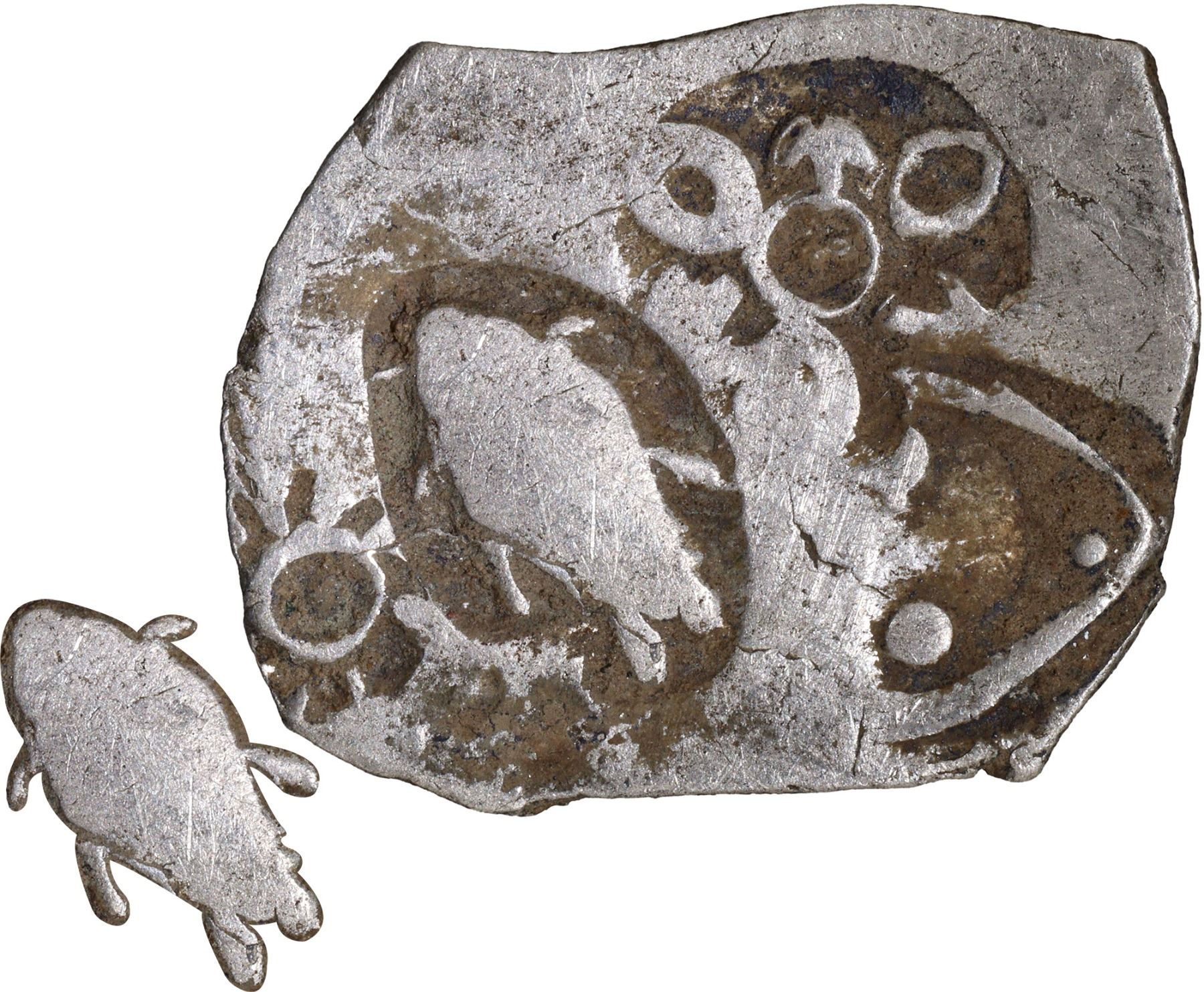 Punch Marked Coin, Magadha Janapada (600-350 BC), Dumraon Hoard type, Silver Karshapana, Series I, Archaic period, Obv: four punch marks consisting of a six-armed symbol, the sun (solar symbol), a fish, and a triangle with three dots (die symbol), Rev: two banker’s marks, 3.5g, 19.05x14.24mm, (JONS. 241 # Plate Coin No. 2), about extremely fine, Very Rare.