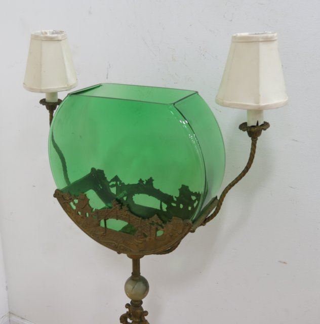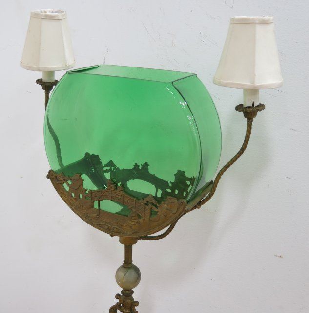 Circa 1930s. Green glass. Marble and gilt metal base. Asian scenes. 2 lamps on sides with silk shades. Approx. 48" H x 24" wide.