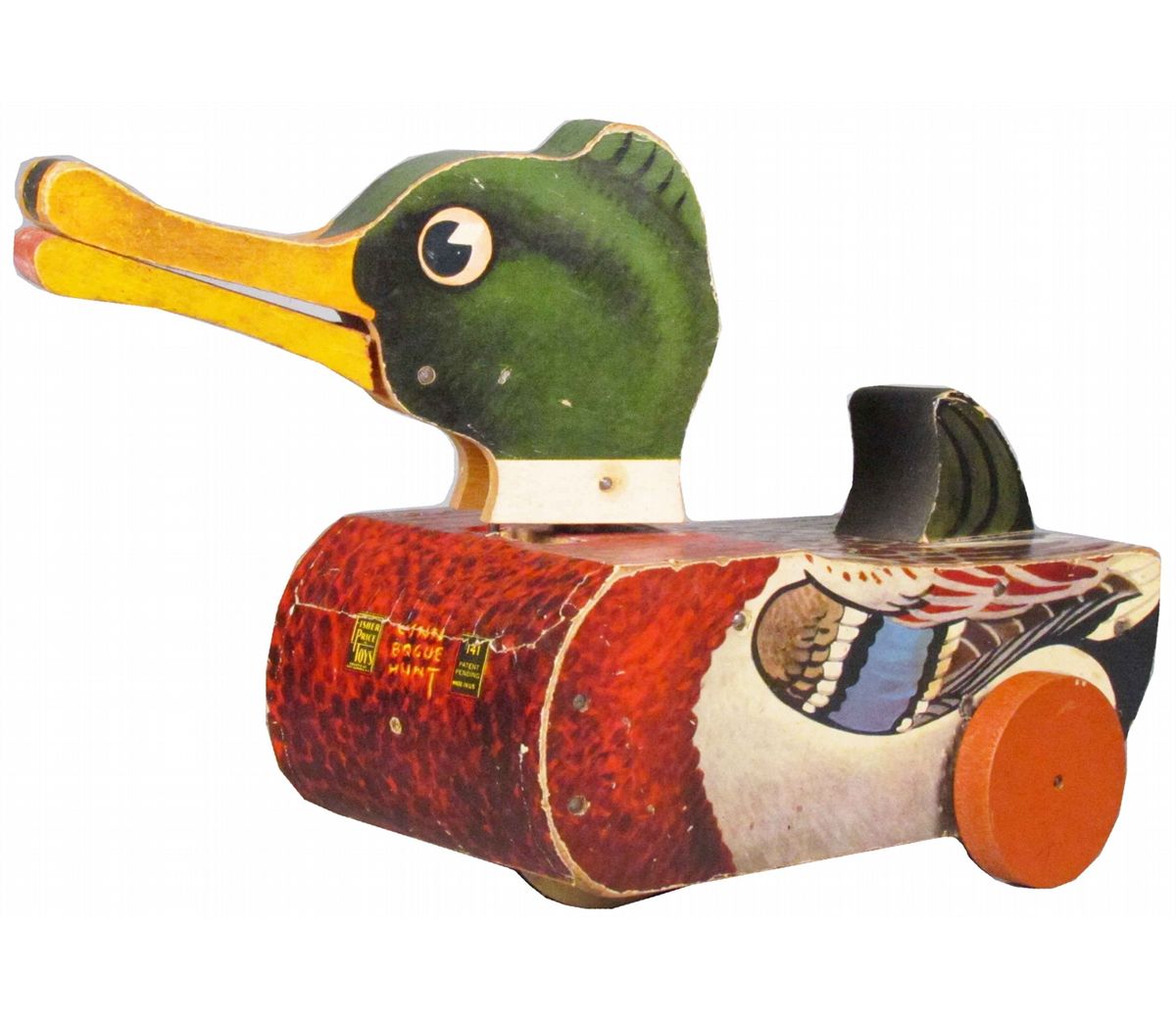 Fisher Price # 141 Snap-Quack Pull Toy, 1947. Mallard duck designed by Lynn Bogue Hunt, nationally known wildlife artist. Age wear otherwise very good condition. 11 inches long.