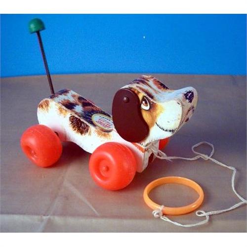 He is adorable. He has been played with, but not abused, has wobble wheels, spring tail with green tip. His paper cover shows some wear, but no tears, his wooden ears are securely in place, his original cord has been replaced by a double string and a plastic ring to pull him by (the only thing not original). His clacker works when pulled. This is the first little one I have seen in this good of a condition... Order three of anything that we can ship in one container, pay with PayPal and shipping is FREE...