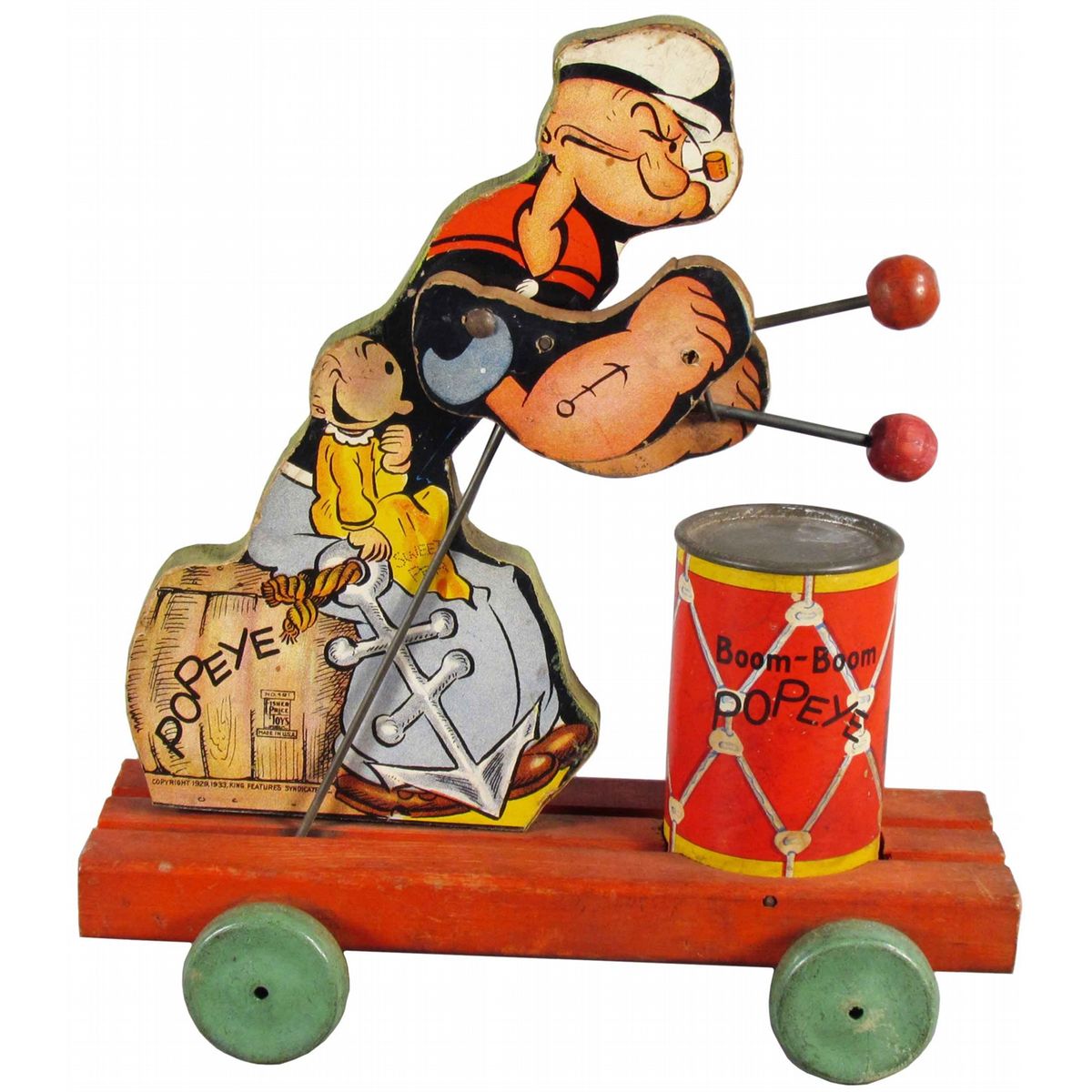 Fisher Price Popeye Boom-Boom Pull Toy. No. 491, 1929 King Features Syndicate. Very good condition. 8 1/2 inches long.