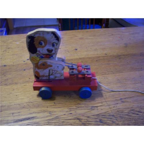 I just purchased a Large amount of items from an Antique shop that closed.This is a Fisher Price wooden pull toy of Merry Mutt.He has the cutest face.He does have a small splinter of wood gone fron his one arm,about 1/2" long.