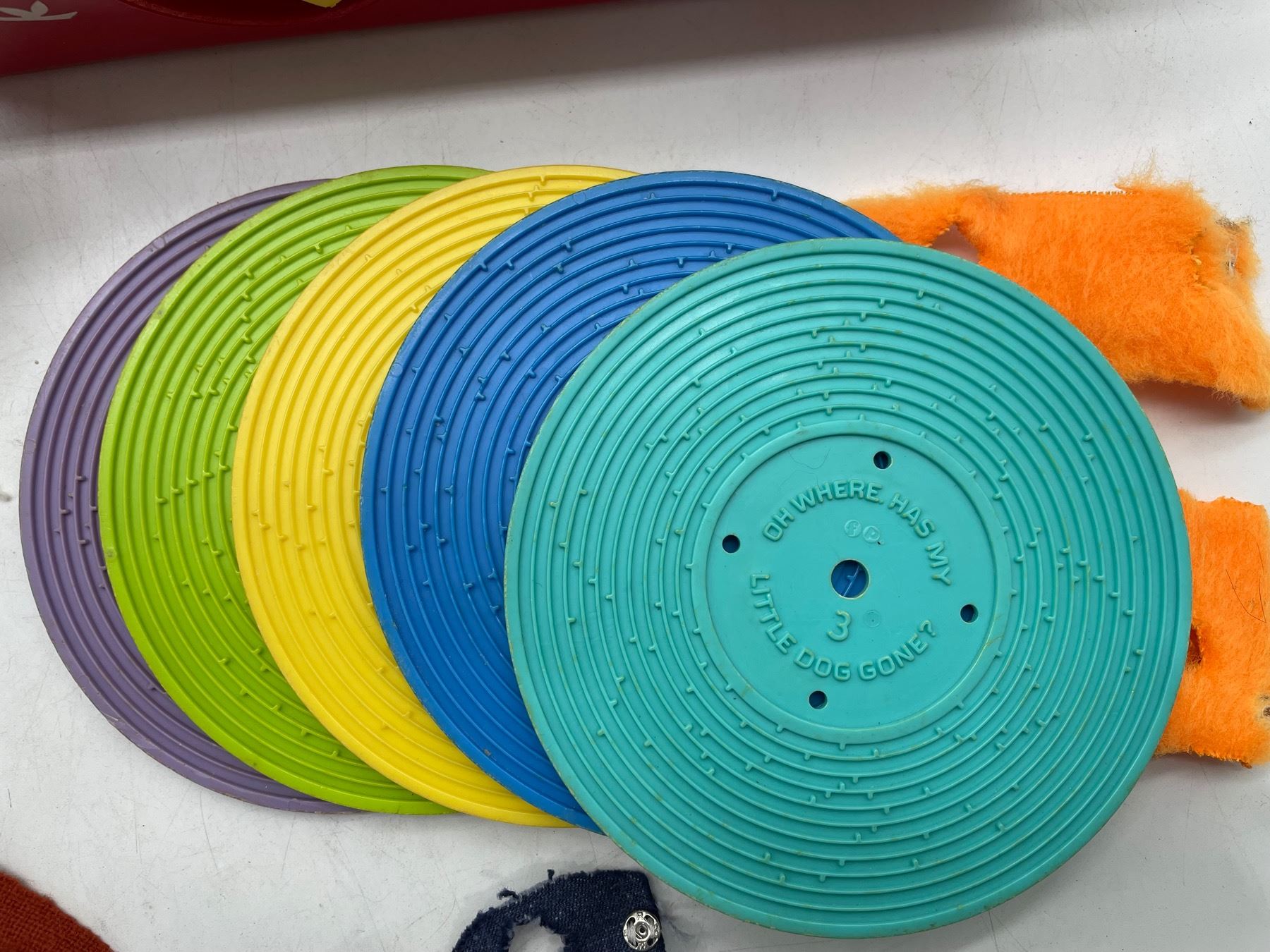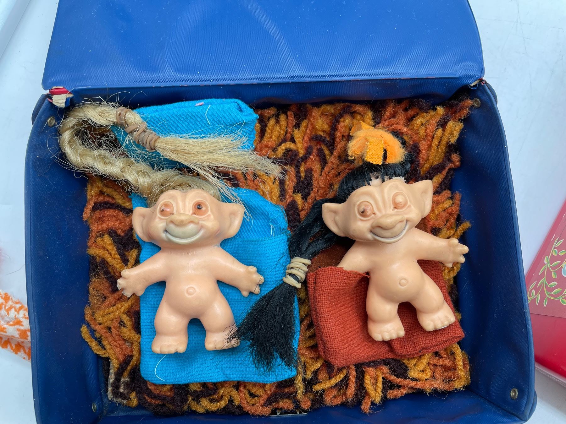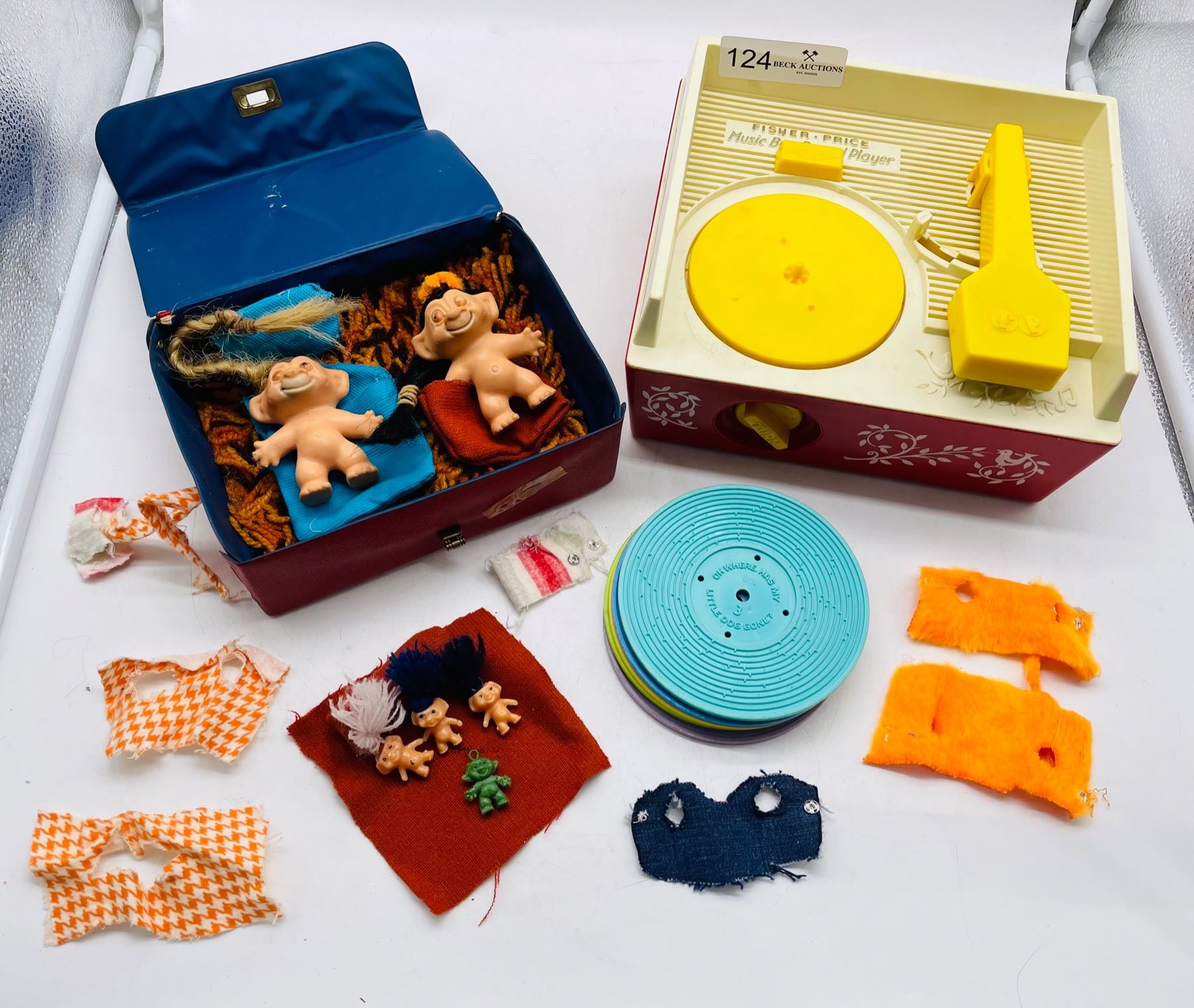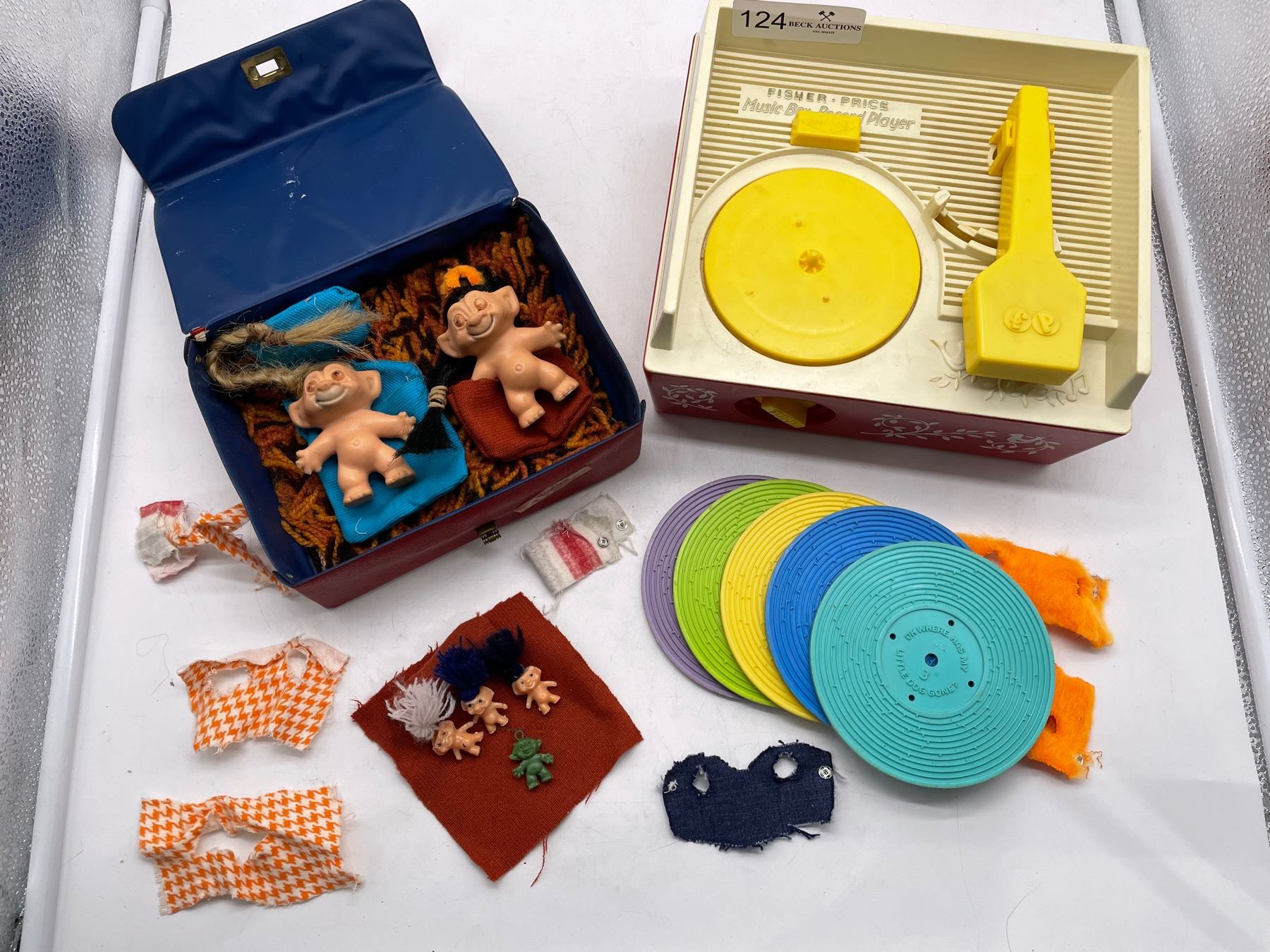 Early 80's Fisher Price record player with 5 records, unfortunately does not work. Lot includes plastic troll does in very worn / used condition.