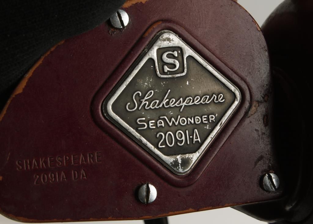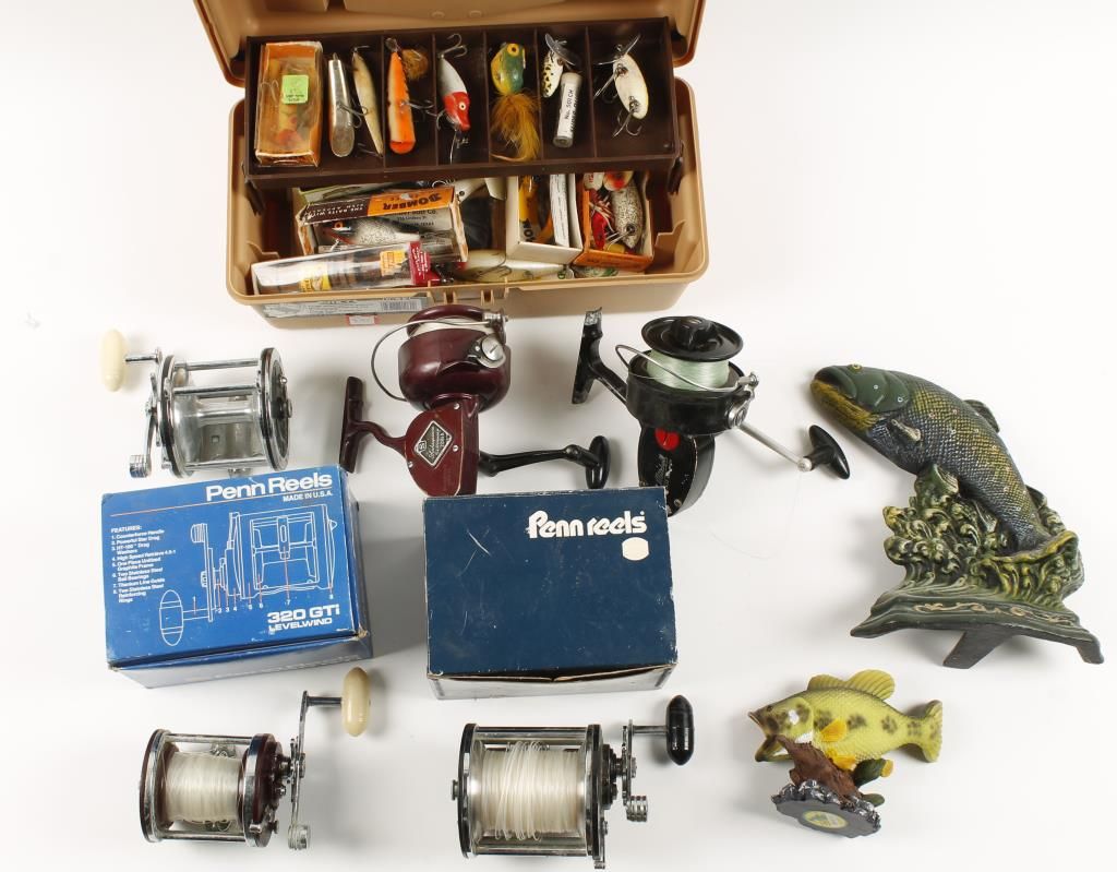 Tackle Box with Lures and Duck Call. Over (25) various lures and jigs, and (1) Faulk's Champion duck call, in original box. (5) reels including: (1) Penn Reels Long Beach Reel #68, with box, manual, and accessories. (1) Penn Reels Jig Master #500. (1) Shakespeare Sea Wonder 2091-A. (1) Garcia Mitchell 30-2 Salt Water. (1) Penn Senator 113. Also with (2) fish figurines.