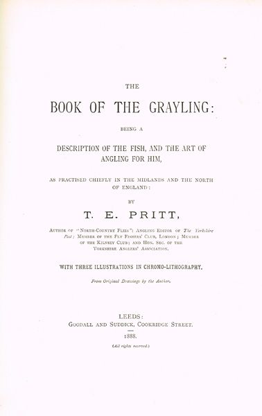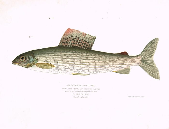 Goodall and Suddick, 1888, 64pp, original boards.The Book of the Grayling: being a Description of the Fish, and of the Art of Angling for him, as practised chiefly in the Midlands and the North of England. With three Illustrations in Chromo-Lithography. From Original Drawings by the Author Large paper issue with coloured plates. A desirable book.