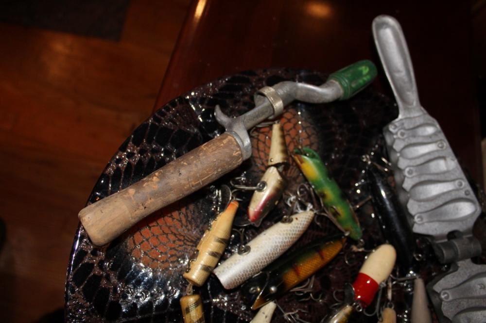 Assortment of early wooden fishing lures, lead mold and ice fishing accessory.