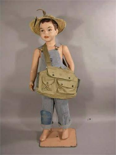 Fishing boy mannequin wearing Osh-Kosh overalls, 40" t. ex. cond.