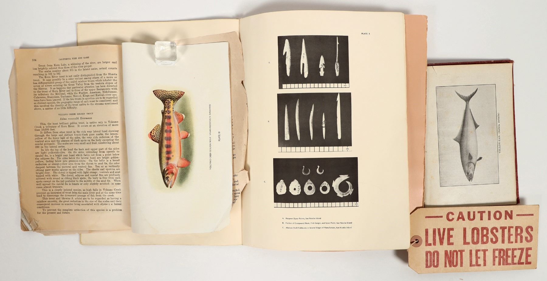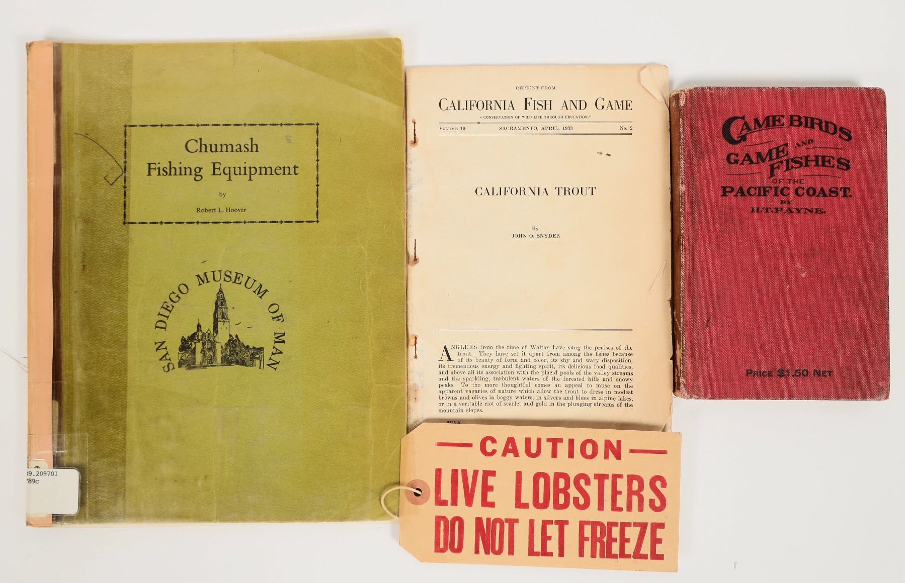 1) Chumash Fishing Equipment by Robert L. Hoover, San Diego Museum of Man. 12pp. 2) Vintage Live Lobsters tag. 3 x 6" 3) Game Birds, Game and Fishes of the Pacific Coast. 1913. HT Payne. 181 pp. Many illustrations. 4) California Fish & Game. 1933 article, California Trout. A few color illustrations.