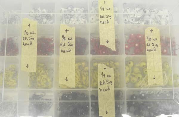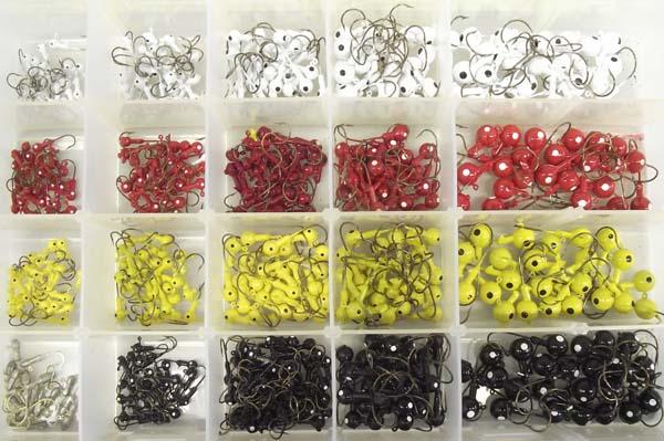 Collection of Fishing Jigs. From 1/16 oz. Red Jig Heads to 3/8 oz. Red Jig Heads. All in plastic box. Buyers Pay Actual Shipping and Handling Charges(see terms and conditions for more information).