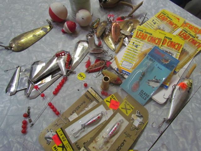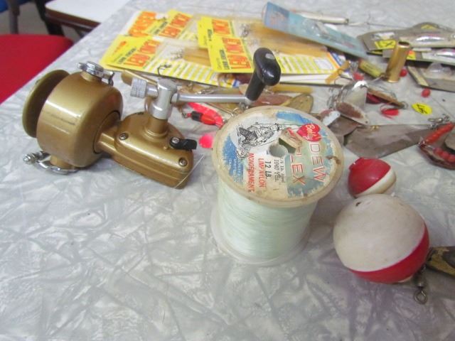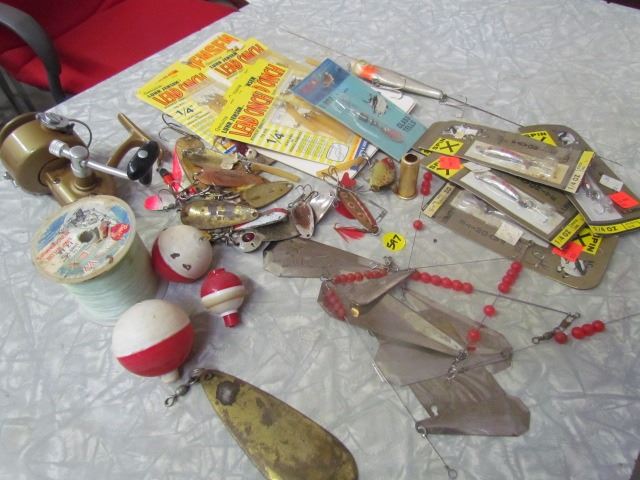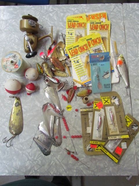 Fishing Lot-Lead Cinch,5 Spin X Hooks,Fjorch Hook,Reel and Line,Assorted Hooks and Parts