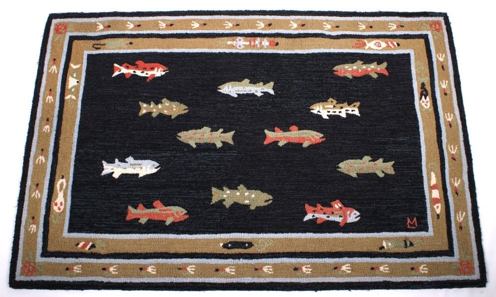 Included in this lot we have a fishing lure and trout patterned wool rug. The rug shows a black field at the center with a double border. The field shows the images of 12 stylized trout in colors of light blue, white, green, tan, black, and red. The borders are made up of bands of blue, tan, and black. The tan sections show patterns of fishing lures, 10 across the inner band and 32 on the outer band. The lures show colors of black, green, red, white, and blue. The rug shows good condition overall with minor wear at the edges. The rug measures 72" long by 47 1/2" wide.