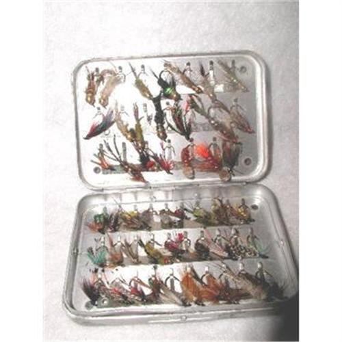 Beautiful set of hand tied and made 19th century English fishing lures. Encased in a silver hinged box with brass feet. The name on back of "Wheatly Silmalloy Metal". One can appreciate the workmanship and display even if not the sport.Set includes 51 lures. Measures 2.5W X 3.5L C .50D closed.