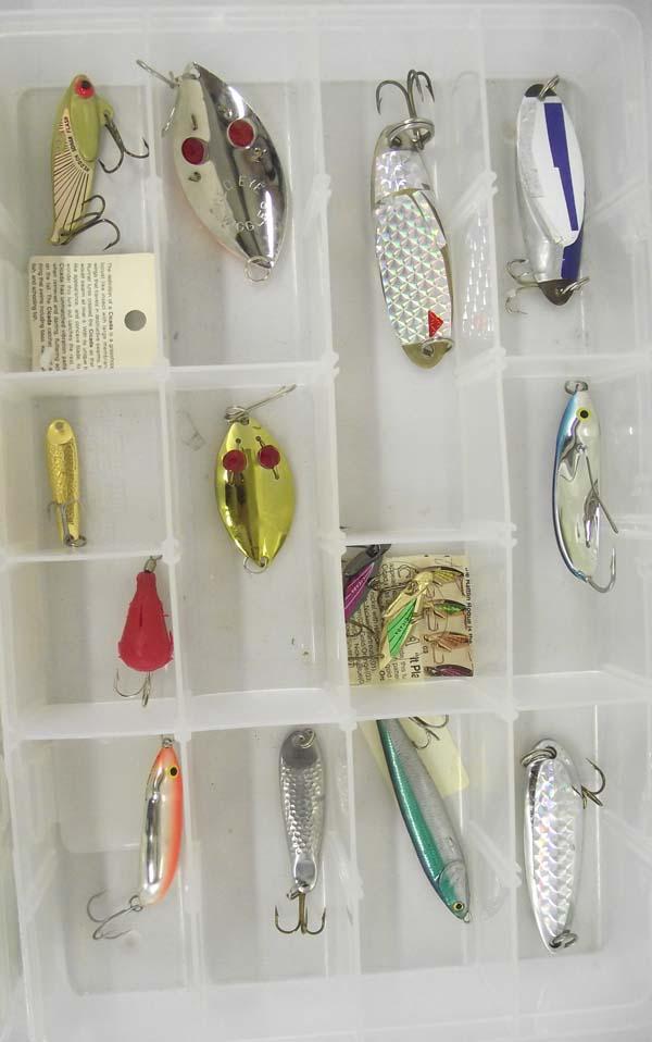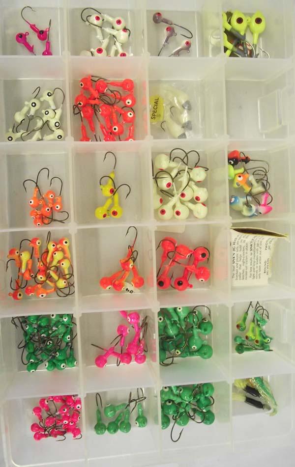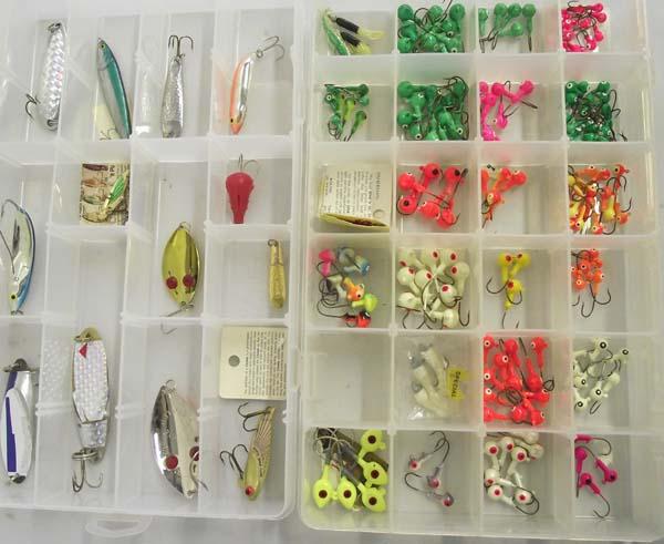 Collection of Fishing Lures & Jigs. To include:Heddon Sonar Flash, Hopkins Shorty, Cicada, Dart, Krocodile, by Luhr Jensen, Hood River, ORE. Red Eye Wiggler. To name a few. Plus a large lot of Sink'n Jig Heads, various colors. Largest lure measures approx. 3 3/4''. 2 Plastic containers hold this great lot. Buyers Pay Actual Shipping and Handling Charges(see terms and conditions for more information).