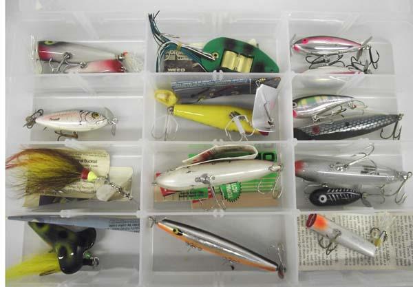 Collection of Fishing Lures. Uncle Buck's Buzzer, original Bucktail, Top Prop and Bucktail Prop, Sputterbuzz, P.J. Pop, rattlin chug bug. To name a few. Longest measures approx. 5''. In plastic case. Buyers Pay Actual Shipping and Handling Charges(see terms and conditions for more information).