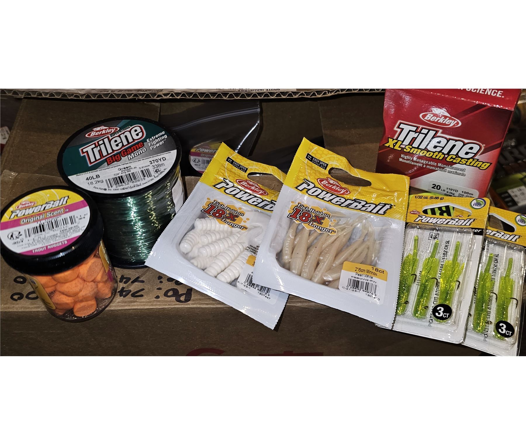 Includes Trilene fishing line, PowerBait soft baits in various sizes and colors; essential for anglers, new.