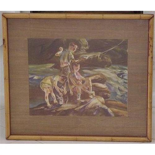 A framed print , 25 3/4" X 29 1/4", three children fishing from a rocky point on a river.  Probably from the 1940's the print is framed with a faux bamboo molding and has a grass cloth matt. The print is signed in the lower right "H.Gusigan".