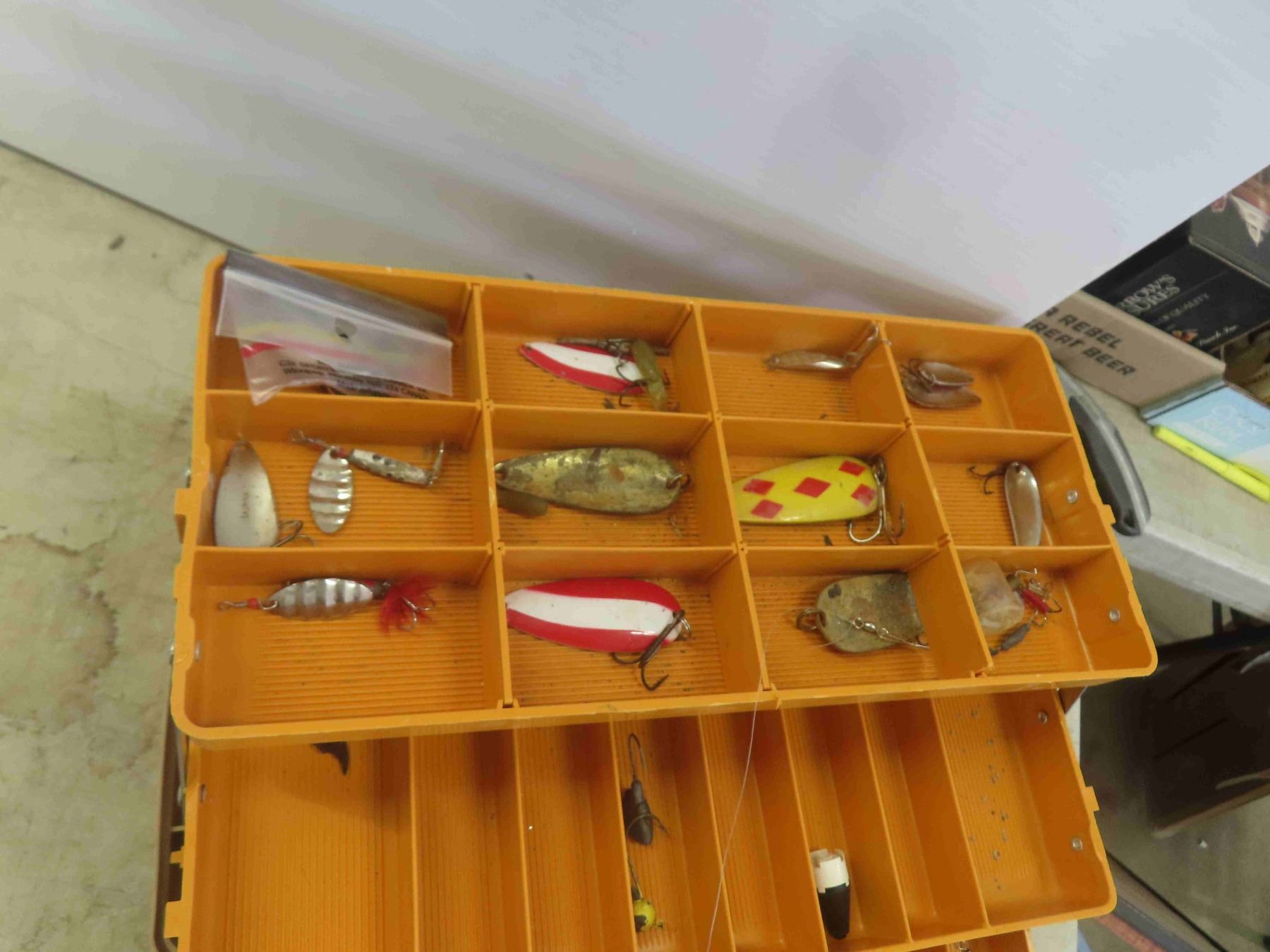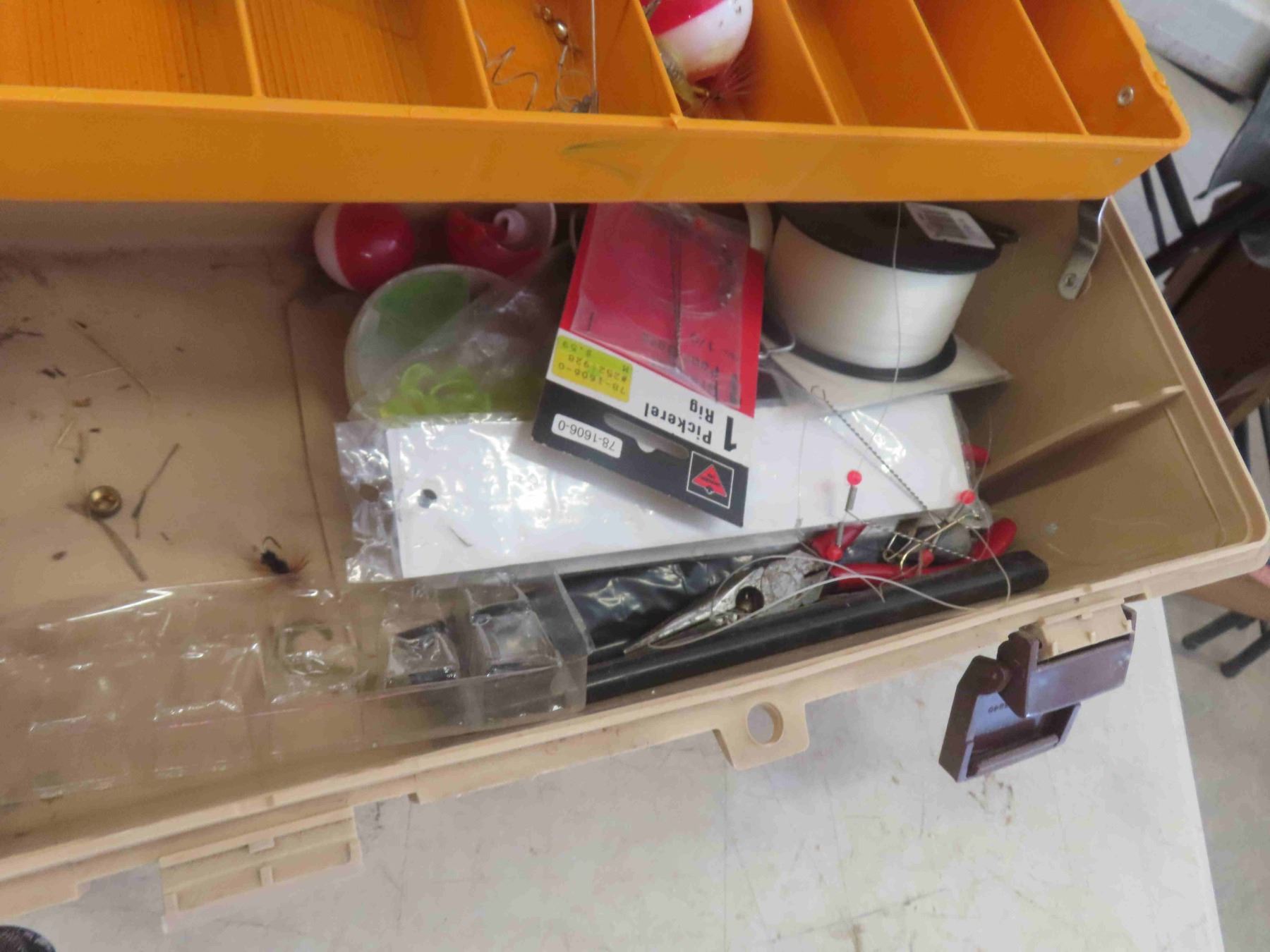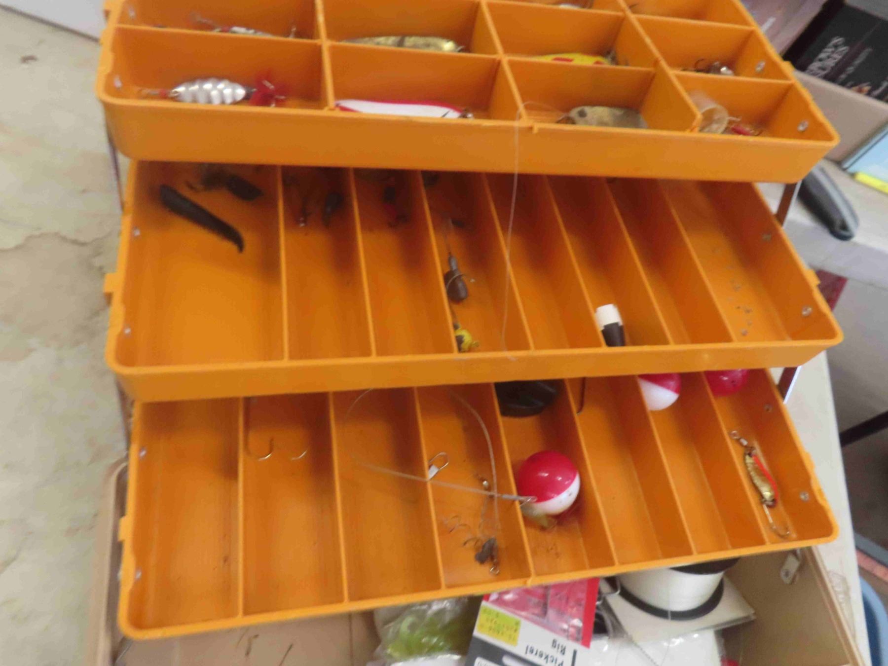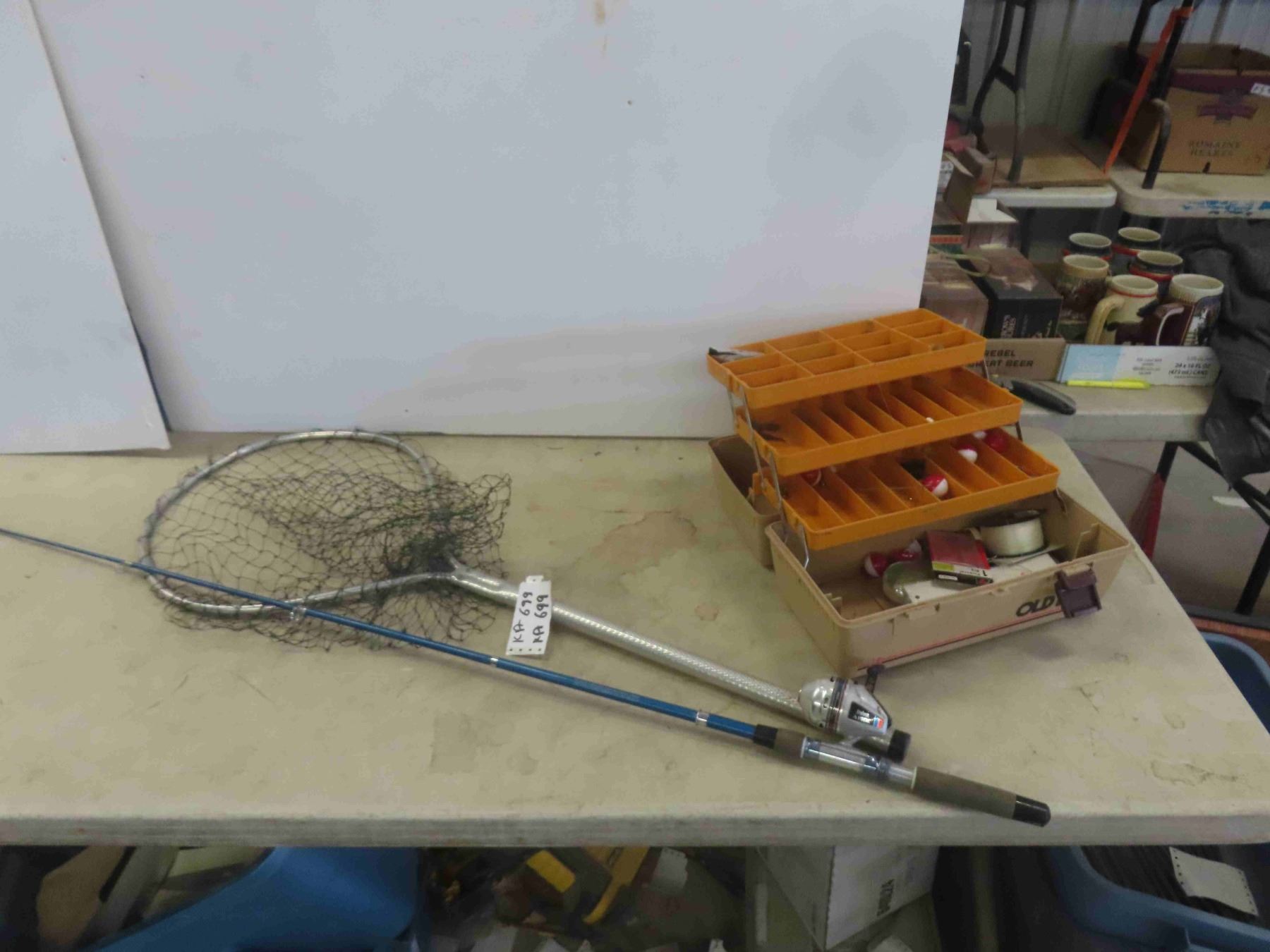Fishing Tackle Box Partially Full of Lures, Hooks, Line, Jigs, Fishing Net