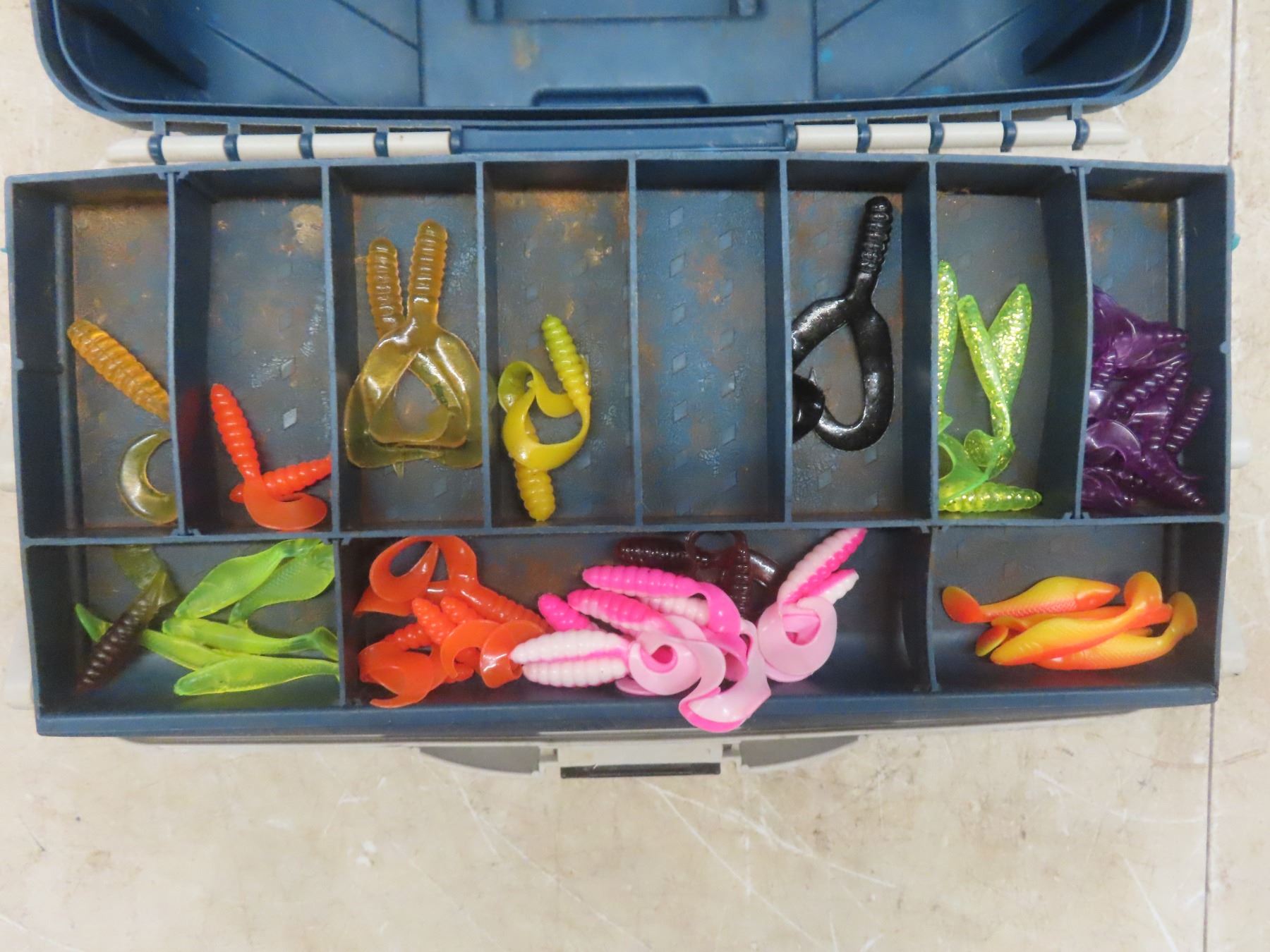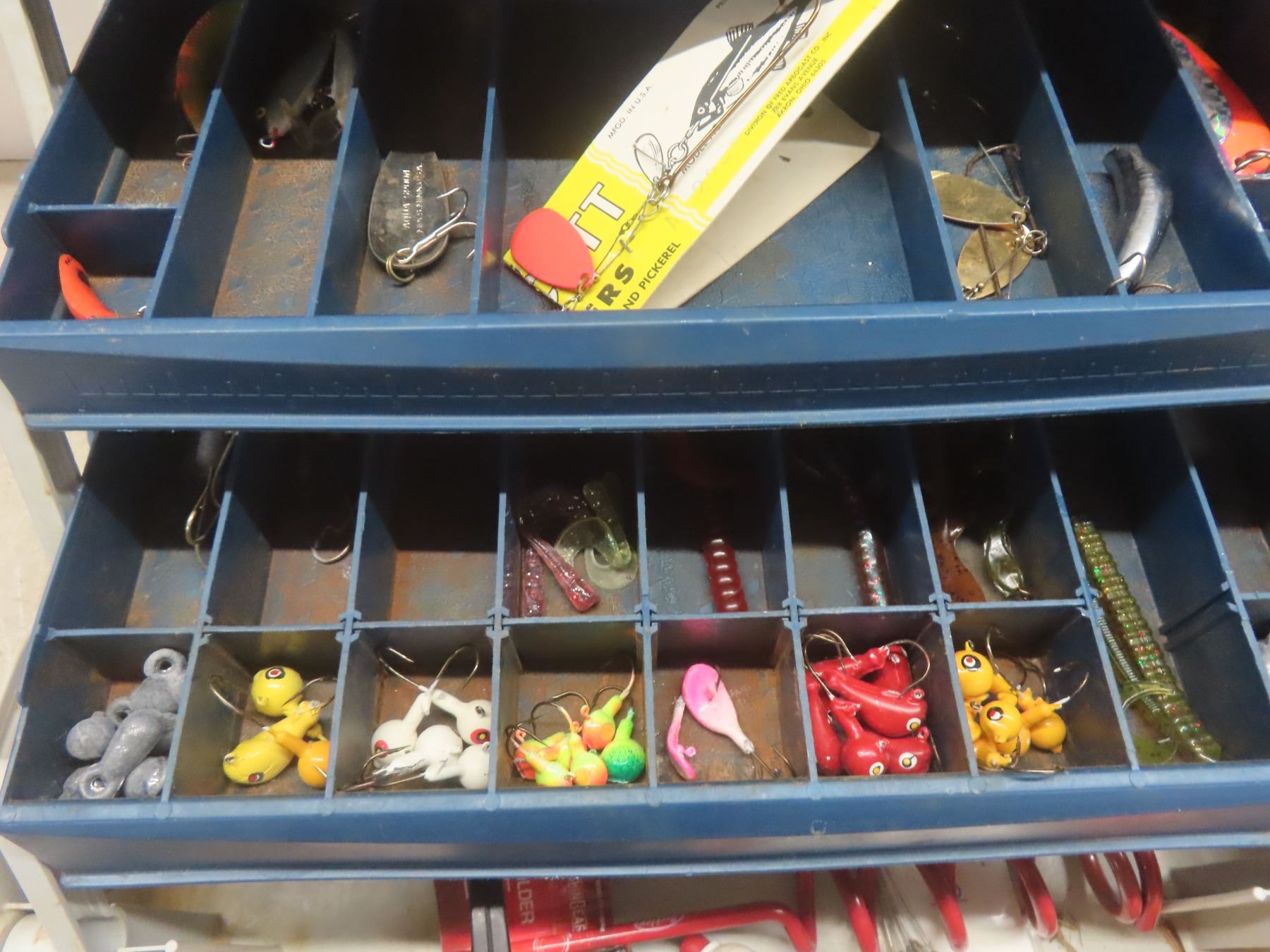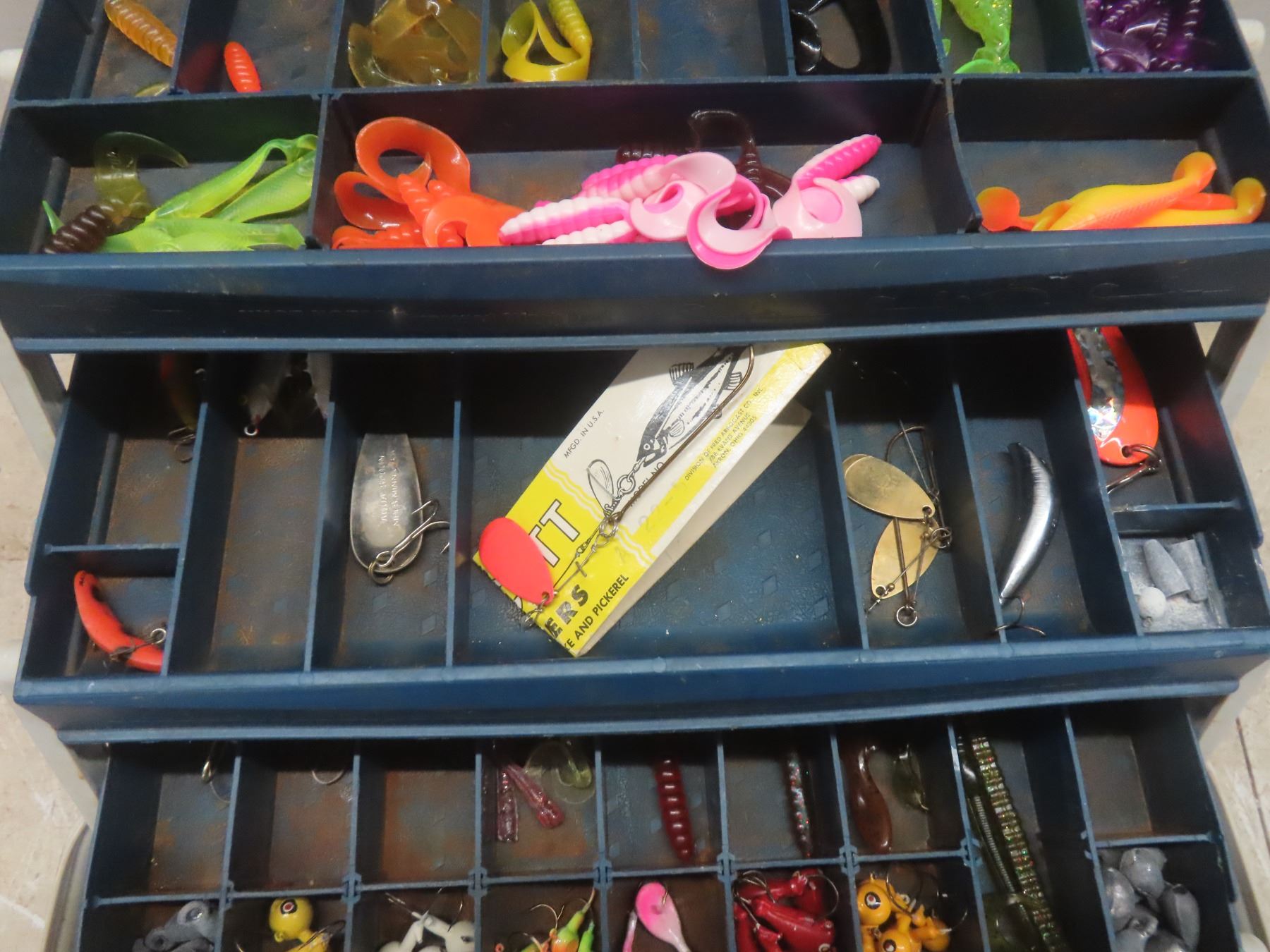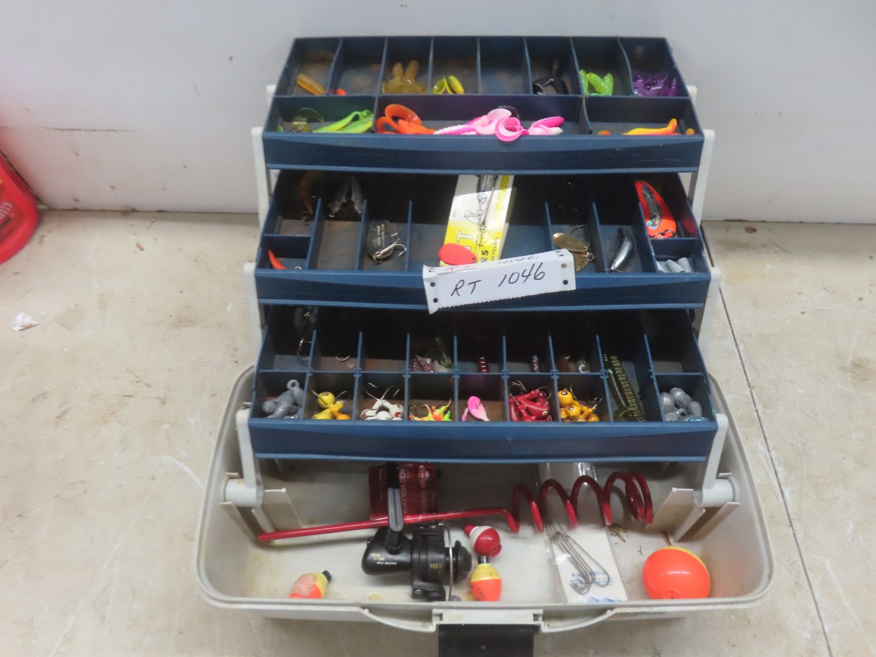 Fishing Tackle Box with Lures, Reel, and Hooks, and More