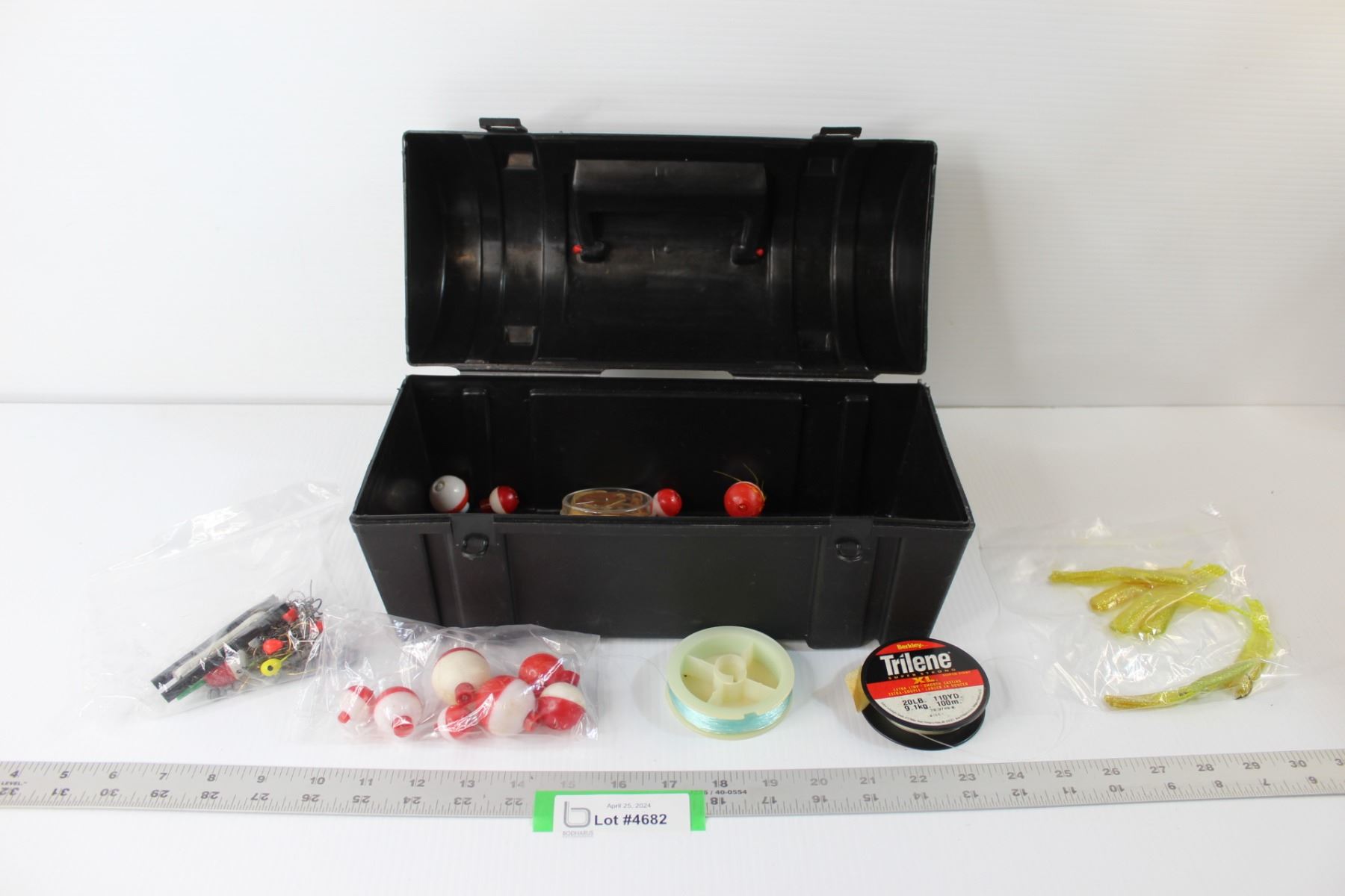 Fishing Tackle Lot: Bobbles, (2) Line Reels, Jig Accessories in Lunch Box Style Box
