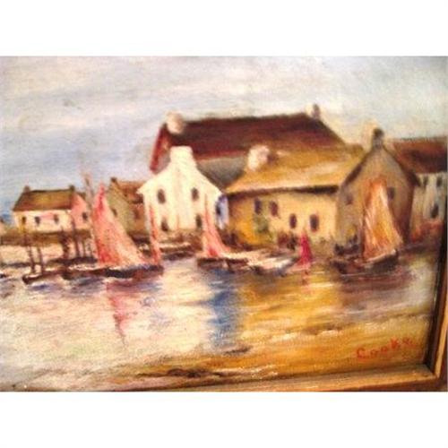 This fantastic Hand Painted Oil Painting on Board is of a fishing village and ite measures 9" by 11.75" and with the frame it measures 10.50" by 13.50 and is artist signed by Cooke.