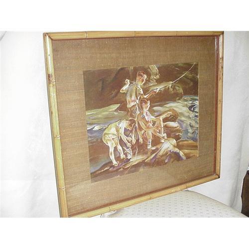 Frame is: 25 3/4" x 29 1/4". Image is: 19 3/4 x 16". Signed, "H. Gusigan" Scene depicting 3 children fishing. Bamboo frame.