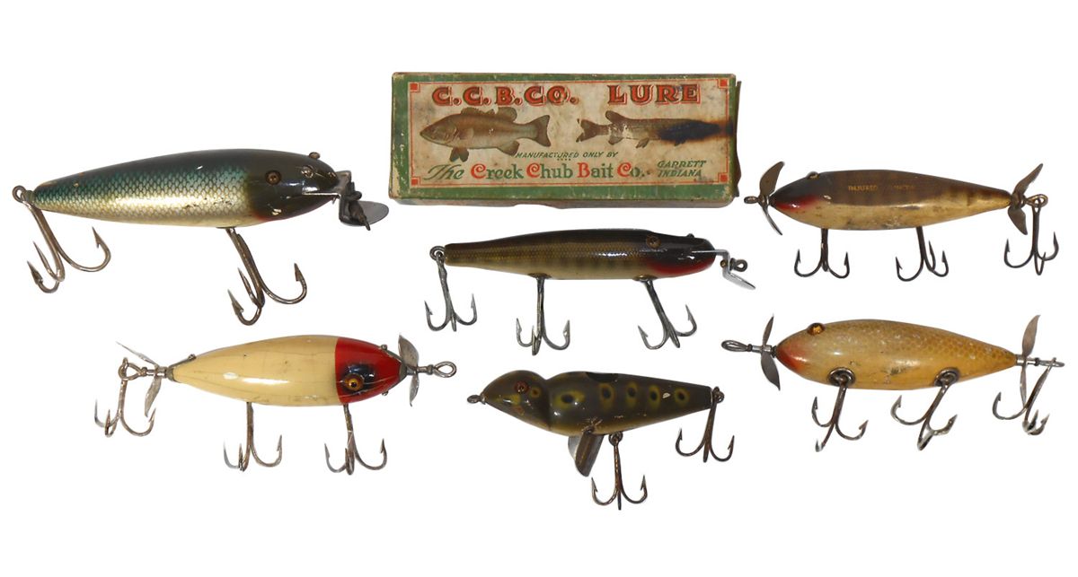 Fishing lures (6), CCB Co. Pikie Minnow w/box, unmarked frog pattern plug (unusual), Injured Minnow,