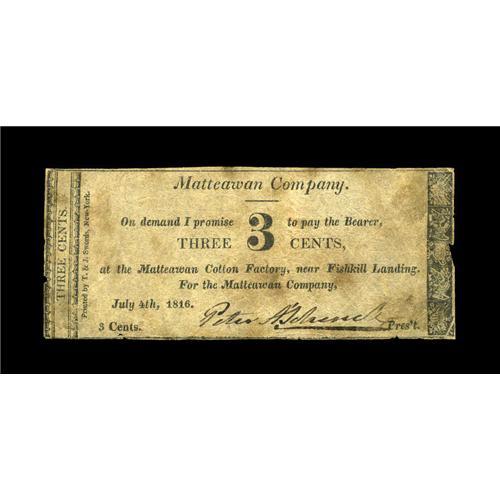 <B>Fishkill Landing, NY- Matteawan Cotton Factory</B></I> (Matteawan Company) 3¢ July 4, 1816 Harris UNL<BR>An extremely rare early Hudson Valley issue which we sold to our consignor back in our May, 1997 sale, where it realized $575 against a $200-400 pre-sale estimate. <B>Fine.</B></I>