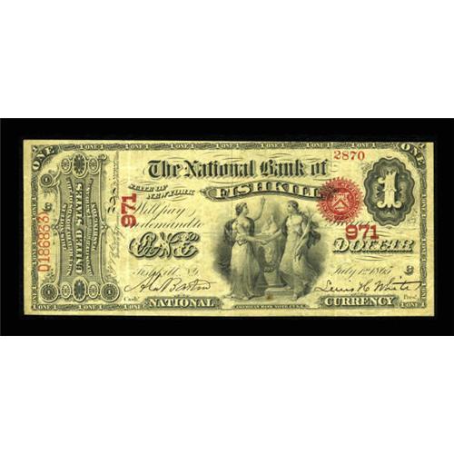 <B>Fishkill, NY</B></I> - $1 Original Fr. 380 <B>The NB of Fishkill</B></I> Ch. # 971<BR> An extremely rare note from the only bank to issue in this historic Dutchess County hamlet. This institution issued First Charters only before disappearing in 1877, with just five notes comprising the complete Kelly census. We sold a Very Fine ace from here in our September, 2003 auction for $9200 (against a pre-sale estimate of $3500-6500) and a substantially lower grade ace from here a year later for $3450. This example, newly discovered and offered here for the first time, is as nice or nicer than any reported previously. <B>Very Fine+++, </B></I>a significant addition to any collection of mid-Hudson Valley material. <BR><BR><b>Shipping:</b> Coins & Currency (<a target="_blank" href="http://www.heritageauctions.com/common/shipping.php">view shipping information</a>)