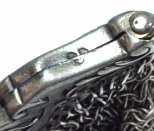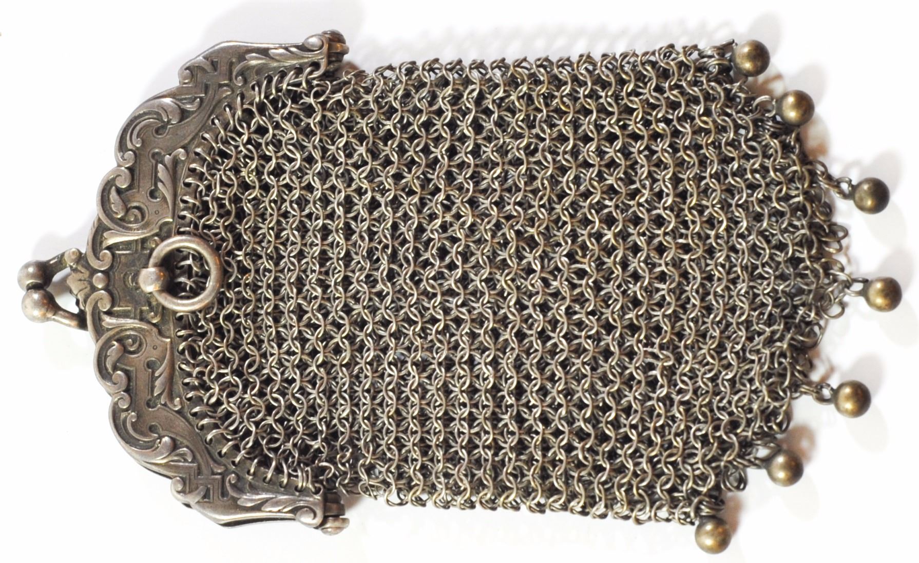 Fishnet coin wallet, Art Deco, silver, with stylized pattern on framing, with dangling balls, inside divided into two compartments. Signed, weight: 40 gm, dimensions: 6x10 cm.