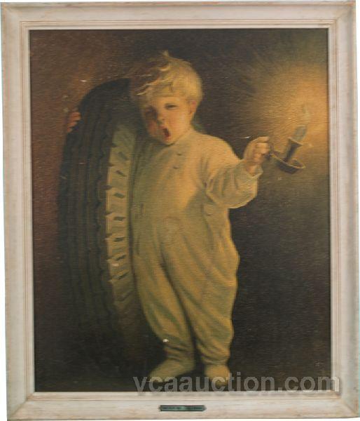 Fisk Tire Cardboard Advertisement "Time To Re-Tire, Buy Fisk", w/ little boy yawning holding candle & tire, in original wood frame - 27" x 32"