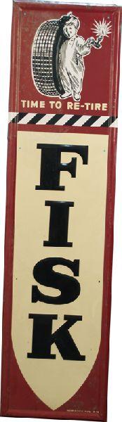 Fisk Tire Embossed Tin Sign, "Time To Re-Tire" c1948, very rare - 16" x 61"