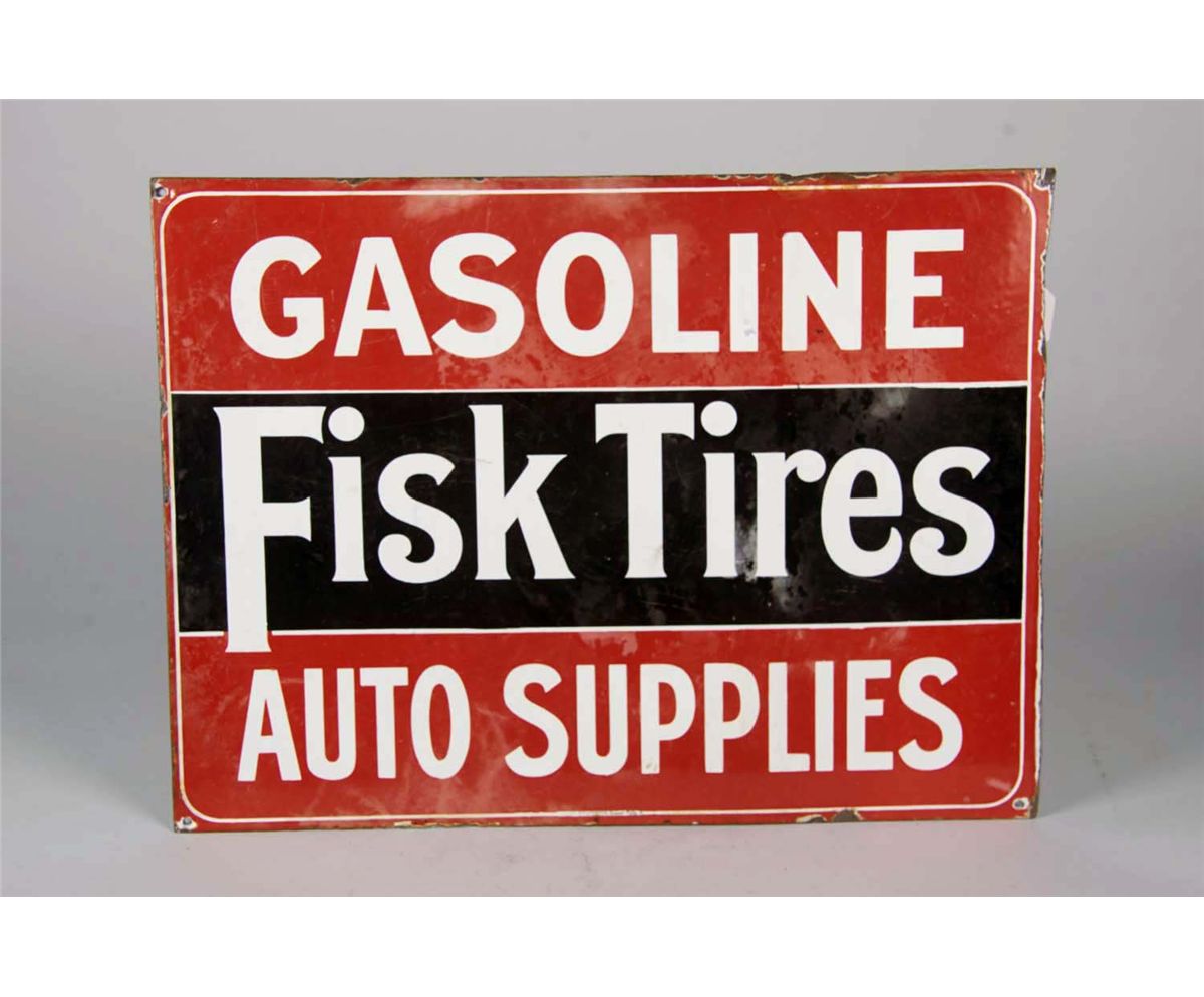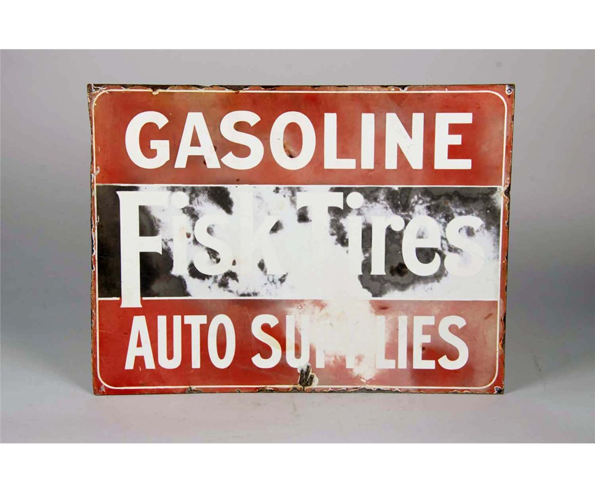 Reads "Fisk Tires - Gasoline - Auto Supplies", Ingram-Richardson, Beaver Falls, Pa. Condition (Fair). Size 23-7/8" x 17-3/4" This sign is believed to be a former flange sign with the flange portion removed.