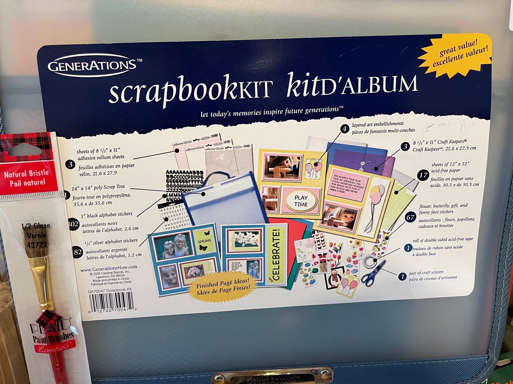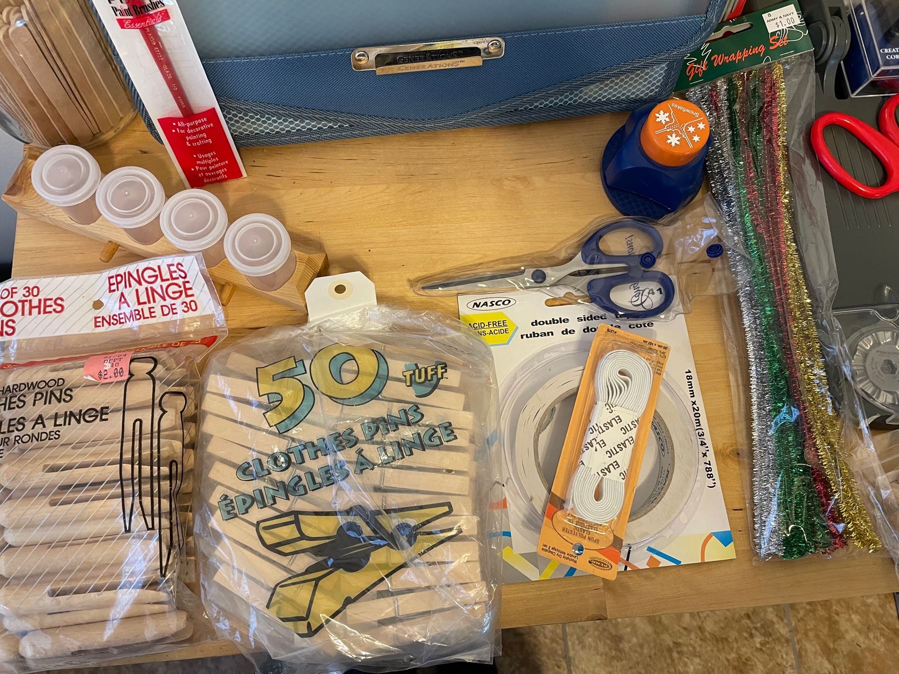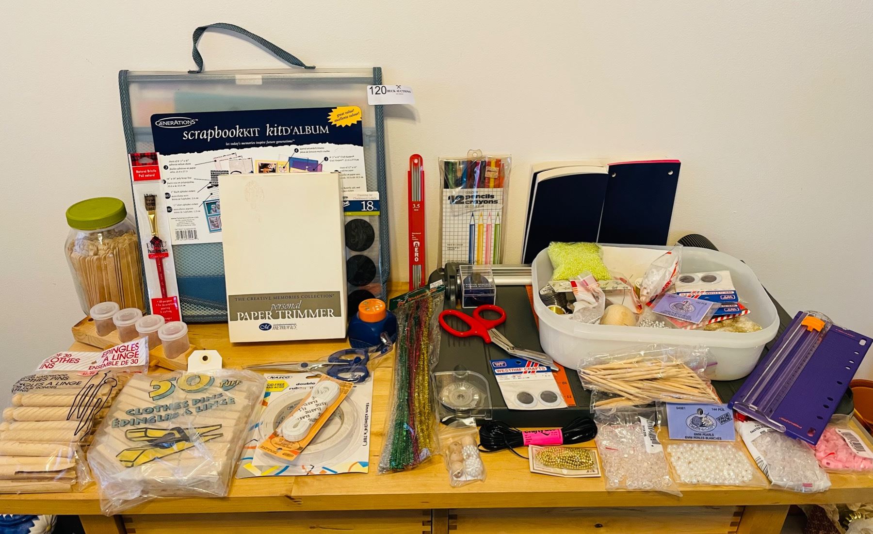 Assortment of crafting supplies inc. popsicle sticks, clothes pins, a binder full of scrapbooking supplies, and more!